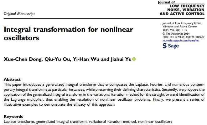 近日,米乐官网数学与大数据学院数学与应用数学专业2021级本科生董学晨、欧秋宇和吴怡函撰写的学术论文“Integral Transformation for Nonlinear Oscillators”在国际学术期刊《Journal of Low Frequency Noise, Vibration and Active Control》上在线发表,论文通讯作者为数学与大数据学院黄大年式教师团队于佳晖博士。