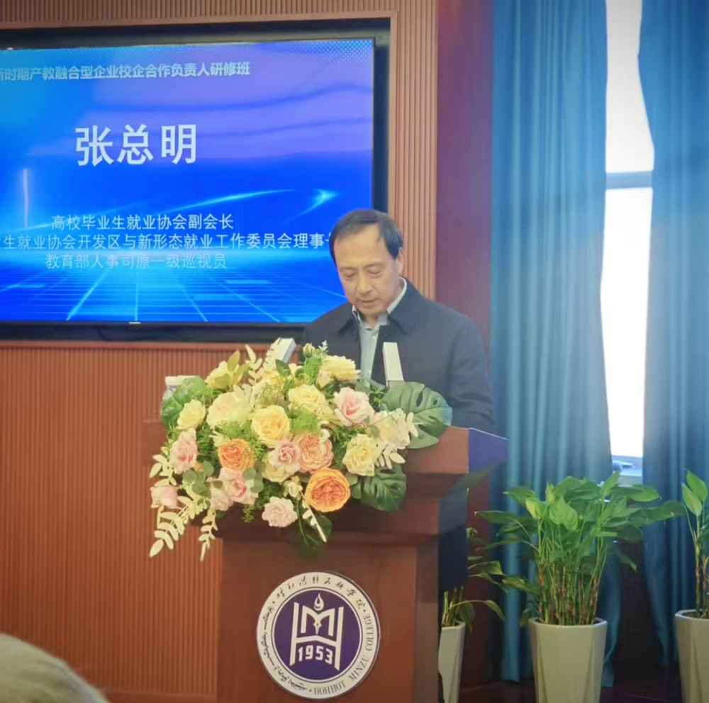 高校毕业生就业协会副会长、教育部人事司原一级巡视员张总明,内蒙古开发区协会执行会长兼秘书长冀晓军,校党委委员、副校长额尔敦布和,高校毕业生就业协会开发区与新形态就业工作委员会、中国开发区协会人力资源服务与产教融合专业工作委员会秘书长赵紫晨,内蒙古工商联原党组成员、秘书长、内蒙古对外交流促进会常务副会长郭贵元,高校毕业生就业协会开发区与新形态就业工作委员会副理事长、三创合一(北京)科技有限公司董事长谢东,呼和浩特市人力资源协会会长、中国开发区协会人力资源服务与产教融合工作委员会副主任付长青,内蒙古金融投资集团有限公司、原党委委员、副总经理张建华,多家商协会负责人、企业家代表约180人出席本次会议。学校专业转型和校企合作学院负责人参加了研修培训。