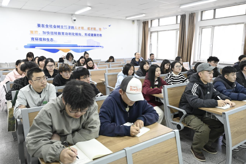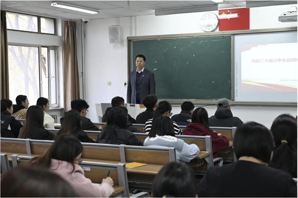 课堂上,双虎分四个部分对二十届三中全会的重要内容和精神实质进行详细解读,结合法学专业的特点,强调了法治建设在推进中国式现代化进程中的重要作用。他说,法学专业的学生肩负着维护社会公平正义、推进法治建设的重要使命,要认真学习领会党的二十届三中全会精神,将其融入到专业学习和未来的职业实践中。他鼓励同学们要树立正确的法治观念,不断提高自己的法律素养和专业能力,为我国的法治建设贡献自己的力量。