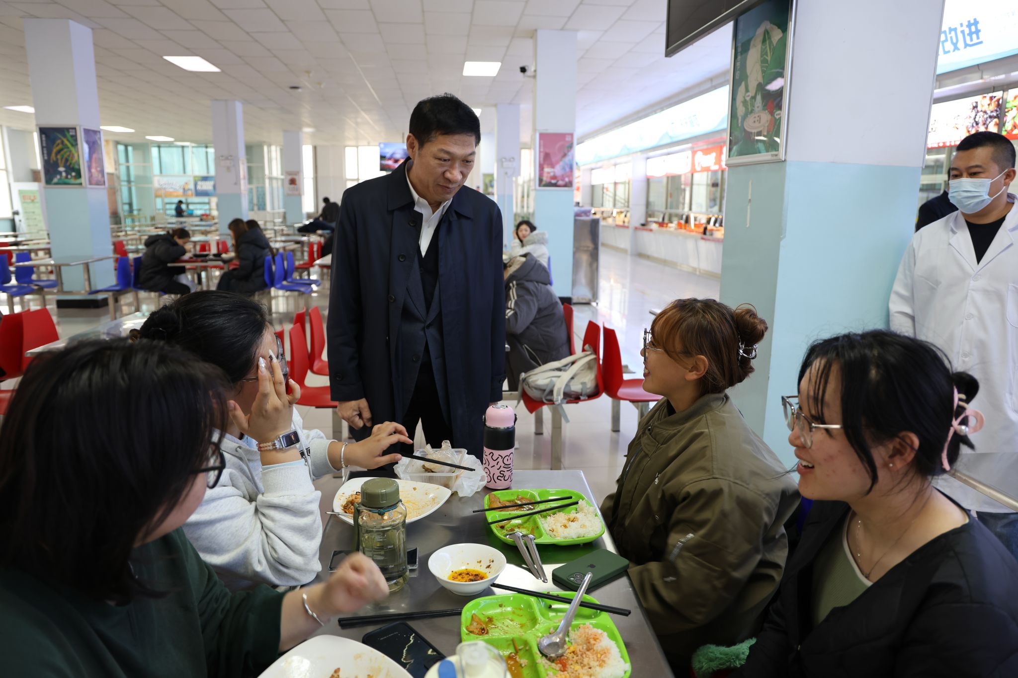 在北区食堂,刘九万与正在就餐的同学们亲切交谈,询问大家的生活和学习情况,了解同学们的心声,听取学生的意见和建议。同学们畅所欲言,表示食堂的品种更多了、环境更好了、价格更实在了。刘九万强调,校园食品安全事关师生身心健康和社会和谐稳定,要强化食品加工全过程、全流程、全链条监管,坚决守牢食品安全底线,要主动倾听学生诉求,合理调整膳食品种,不断提高饭菜质量和服务水平,确保广大师生吃得安全、健康、营养。