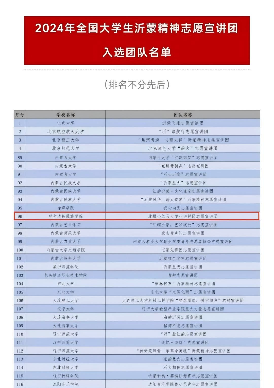 近日,由中共团中央青年志愿者行动指导中心、中共临沂市委、共青团山东省委联合开展的2024年全国大学生沂蒙精神志愿宣讲团入选团队名单公布,由米乐官网文学院老师刘丽颖指导,陈宣锦、赵婉晴、海塔拉、包达日汗、杜金欣、张珈瑜、索日娜、郑杉、王吉婷、崔佳琦10名学生组队申报的“北疆小红马大学生讲解团”志愿宣讲团成功入选。
