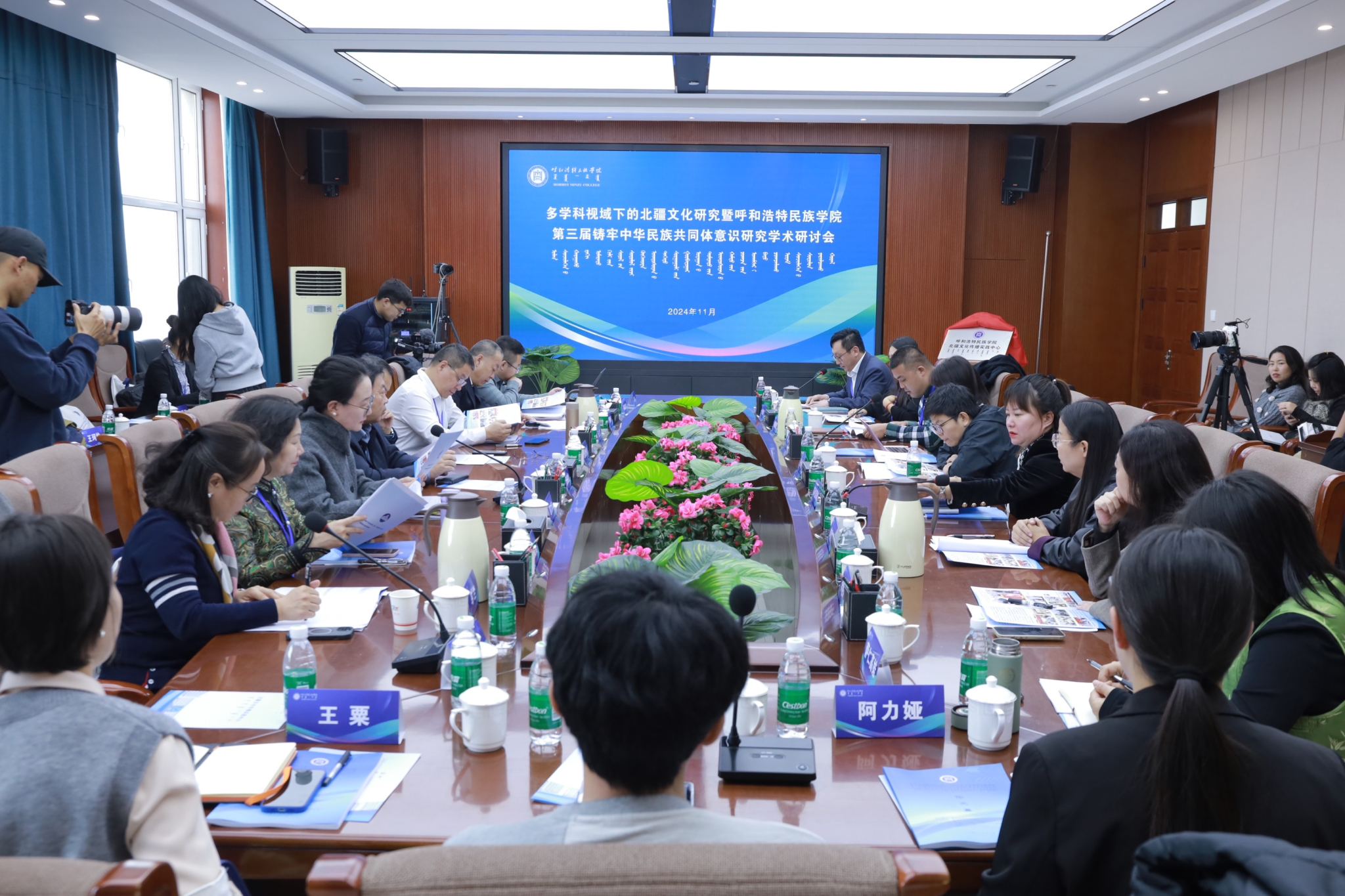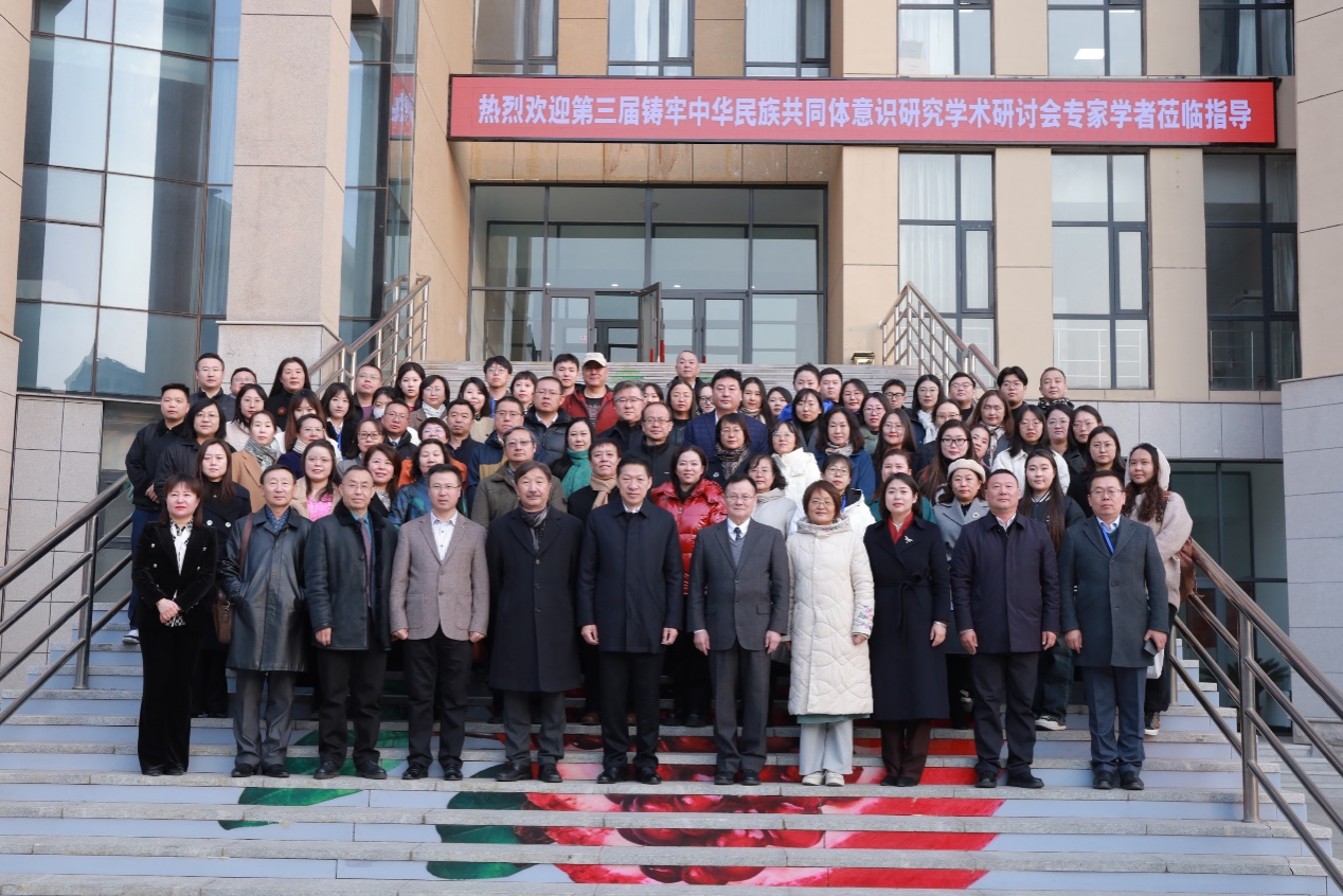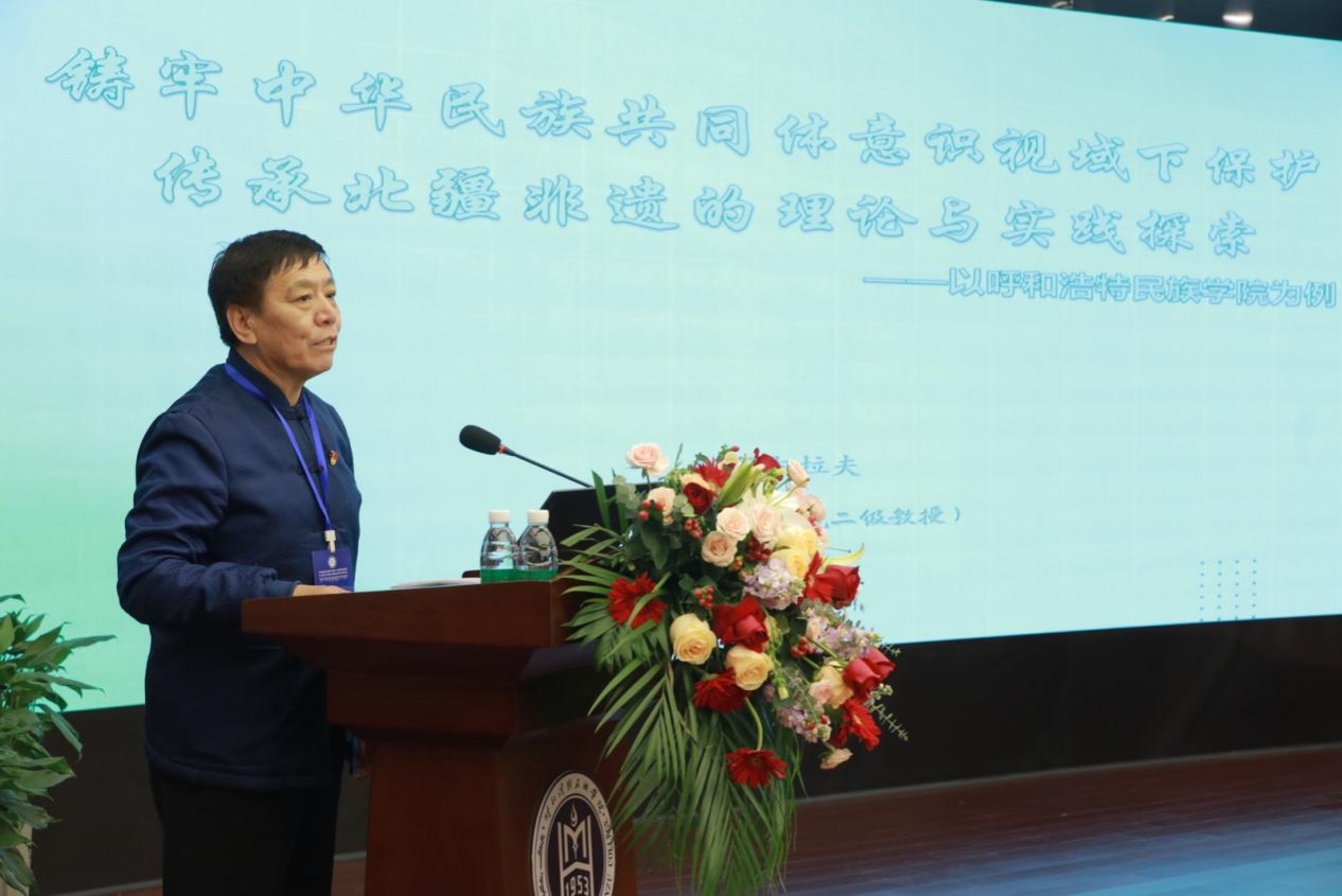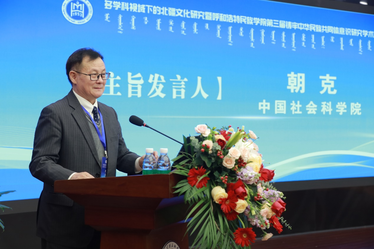 11月23日,学校铸牢中华民族共同体意识研究基地、蒙古族非物质文化遗产研究基地、北疆文化传播实践中心、新时代内蒙古三少民族语言文化研究基地联合举办了 “多学科视域下的北疆文化研究暨第三届铸牢中华民族共同体意识研究学术研讨会"。来自中国社会科学院、中国人民大学、兰州大学、新疆师范大学以及区内外各高校、科研机构的100余名专家学者出席本次学术研讨会。国家民委教育司一级巡视员周晓梅,自治区民委党组成员、副主任云冰,内蒙古自治区人大科教文委副主任委员、内蒙古日报社原总编辑、社长吴海龙,中国社会科学院蒙古学研究中心主任包胜利,内蒙古广播电视台新闻中心摄像部原主任、高级编辑包金花,内蒙古自治区民委理论研究处处长张玲玲等嘉宾应邀出席研讨会。校党委书记、铸牢中华民族共同体意识研究基地主任刘九万出席会议并致开幕辞。校党委副书记格根哈斯主持研讨会开幕式。校党委委员、副校长额尔敦布和主持研讨会主旨报告环节。