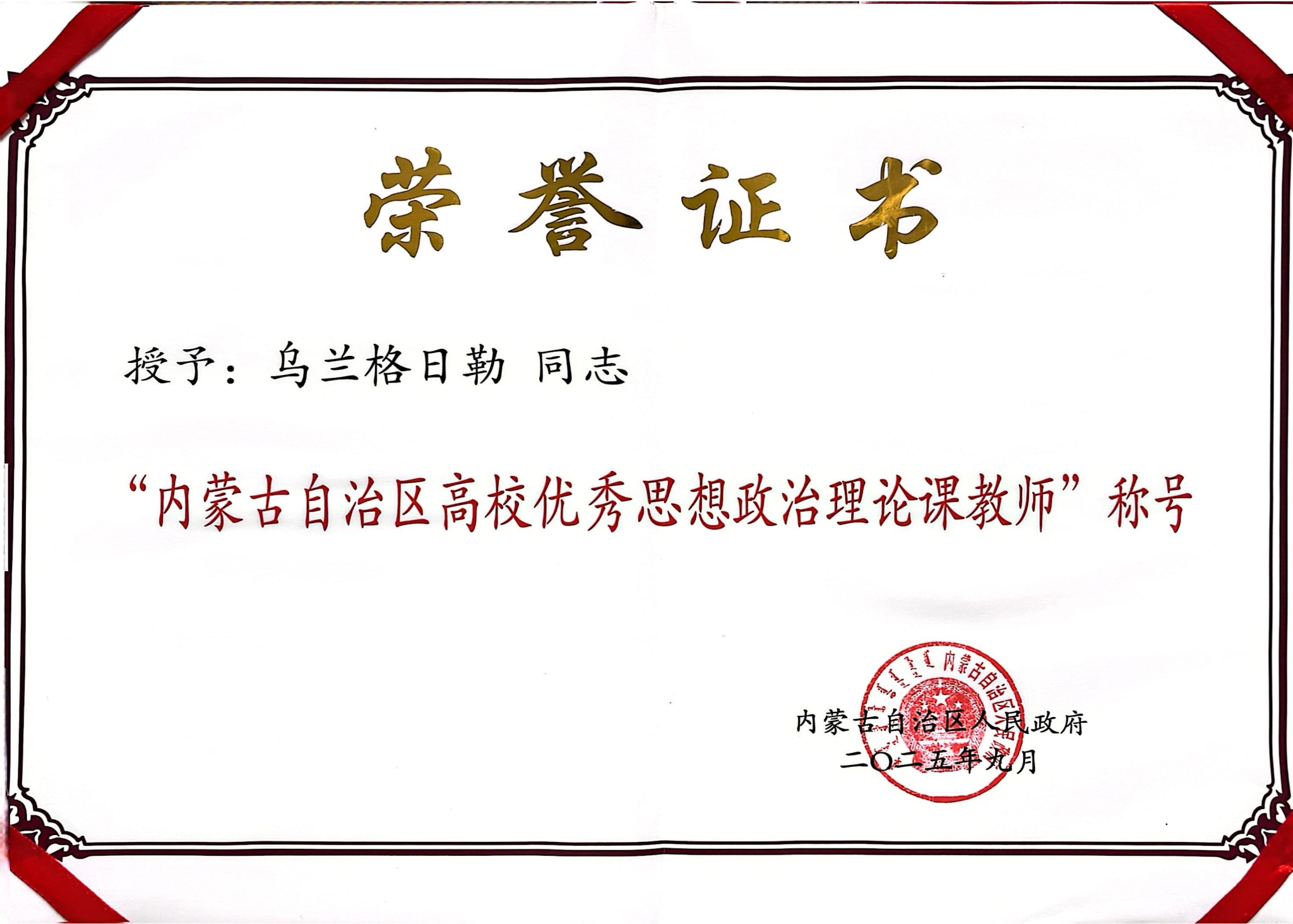 时逢第41个教师节,内蒙古自治区人民政府表彰了2025年全区教育系统先进集体和先进个人,米乐官网马克思主义学院乌兰格日勒老师获评“内蒙古自治区高校优秀思想政治理论课教师”荣誉称号