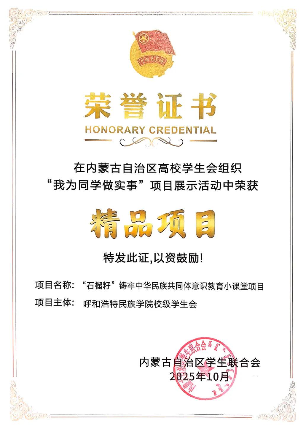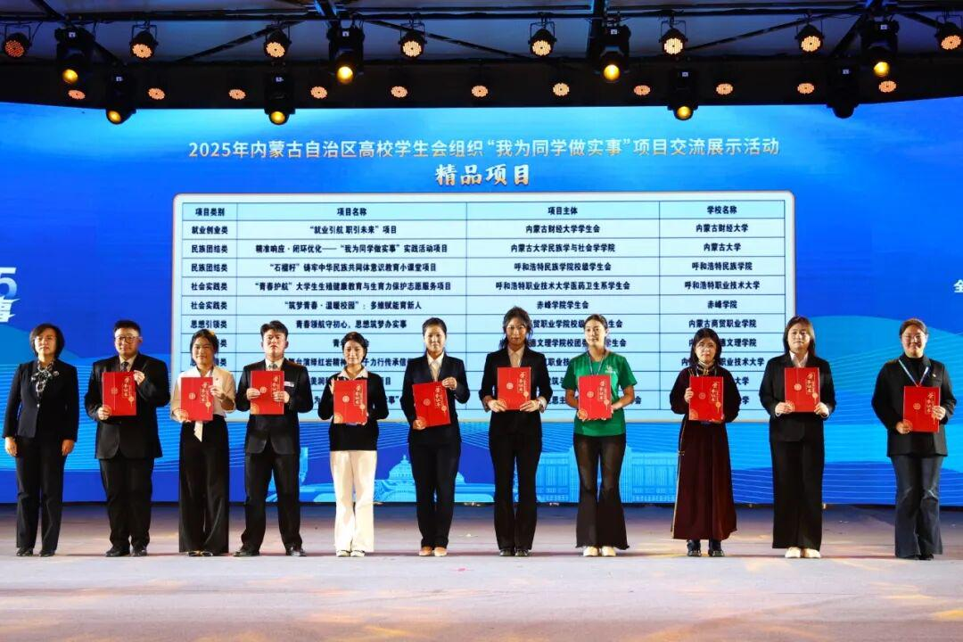 由共青团内蒙古自治区委员会指导,内蒙古自治区学生联合会主办的2025年“我为同学做实事”项目交流展示活动于10月19日至20日在内蒙古建筑职业技术大学举行。全区58所高校共申报186个项目,经过严格评审,最终37所高校的50个项目入围展示活动,并评选出20个“精品项目”、30个“优秀项目”。米乐官网团委推选的《“石榴籽”铸牢中华民族共同体意识教育小课堂》项目,荣获“精品项目”。