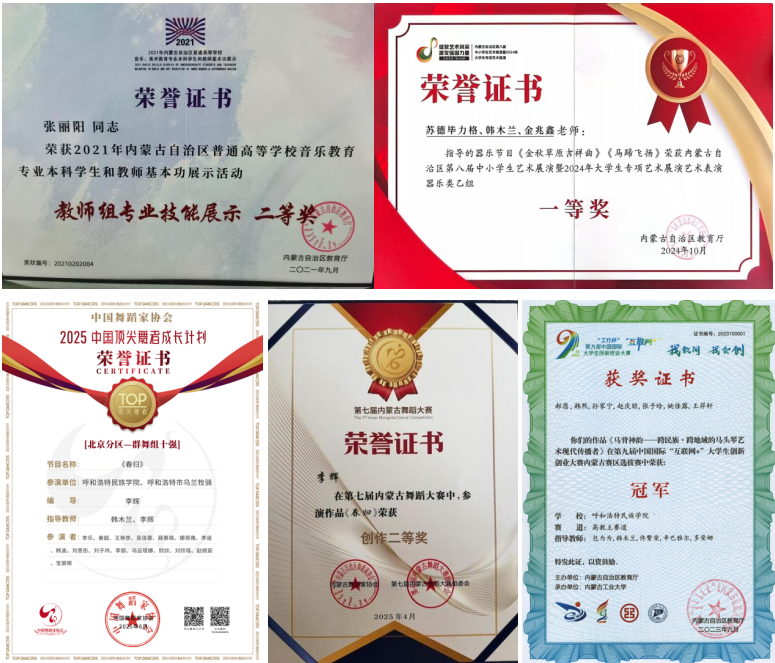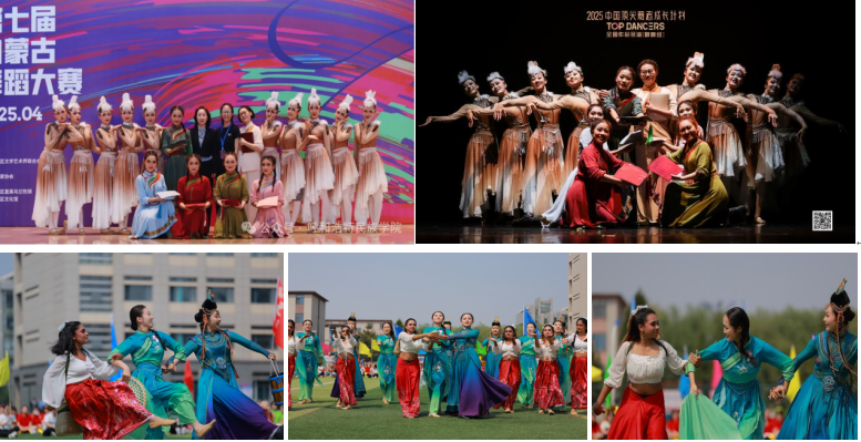 实践教学是提升能力、传承艺术、对接需求的核心路径。学院开设《舞台实践》等课程,高强度排练提升舞台表现力,依托实践与校企合作推进成果转化,定期举办汇报演出,组织乌兰牧骑社区演出。拓展校外平台,与多家机构共建实习基地,邀请演员指导,延聘专家训练。创新“教学—科研—创作—表演一体化”模式融入课堂。原创《春归》获舞蹈大赛双项二等奖,跻身顶尖舞者计划并亮相展演;《马蹄飞扬》《金秋草原》获艺术展演一等奖。