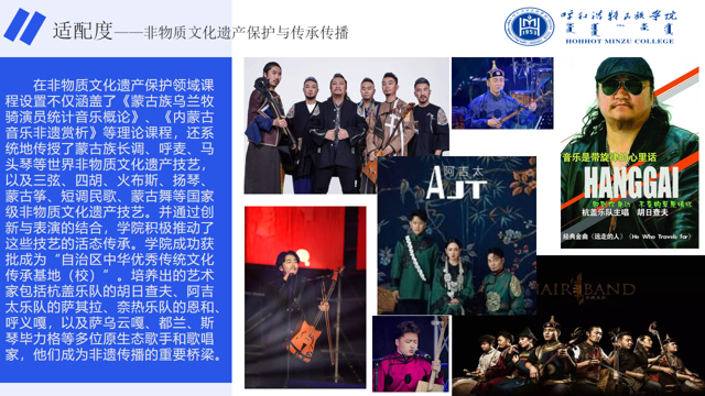 学院立足内蒙古、面向基层,设音乐表演、音乐学(教育方向)、舞蹈学专业。紧扣国家与区域发展需求,服务乡村振兴,构建教学—科研—传承—创作—表演一体化课程体系,培养专业素养深厚、实践能力突出的音乐舞蹈人才。推进一流专业建设:音乐学专业校级一流,三门校级一流课程,两门自治区级一流课程;马头琴教学获批中华优秀传统文化传承基地。创新创业项目《马背神韵》获互联网+大赛区赛冠军、全国金奖,彰显教育成果,已孵化公司创收盈利并带动就业。