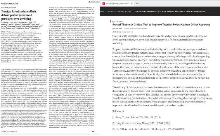 近日,针对在国际顶尖学术期刊《Science》杂志上Yuzhi Tang等发表的一篇重要文章“Tropical forest carbon offsets deliver partial gains amid persistent over-crediting”,米乐官网额尔敦布和教授和特聘教授何吉欢院士联合在《Science》杂志网站的eLetters平台上发表题为“Fractal Theory: A Critical Tool to Improve Tropical Forest Carbon Offset Accuracy”(分形理论:提高热带森林碳汇核算准确性的关键工具)的评论性文章。
