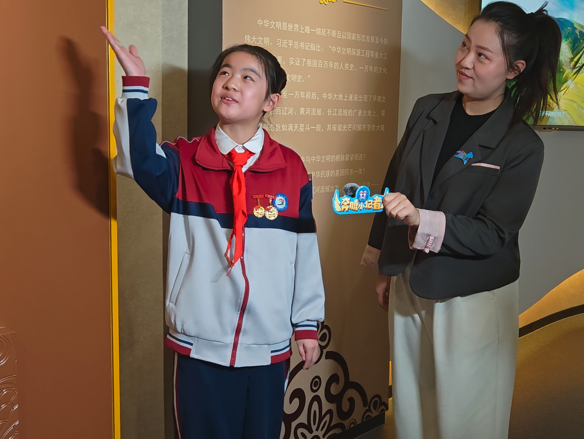 在活动中,“北疆小红马”大学生讲解员陈宣锦,以大手拉小手的方式,带领于思涵、王赟泽、王宸菲、鲁旭瑶、肖清云、郝思语等6位北垣小学(公主府校区)的红领巾讲解员一道开展讲解。讲解员们以中华文明的起源为起点,结合馆内丰富的图文、实物以及多媒体互动等教育资源,引导小记者们探索“我们从哪里来?”“我们是谁?”“我们要到哪里去?”等问题,深入理解中华民族共同体的含义。参观结束后,美术与设计学院的大学生与小记者团成员共同创作了以“石榴籽 心连心”为主题的画卷。本次活动通过“听、看、绘”相结合的方式,使青少年在行走的课堂中埋下爱我中华的种子,树立正确的国家观、历史观、民族观、文化观、宗教观,巩固民族团结的思想根基。