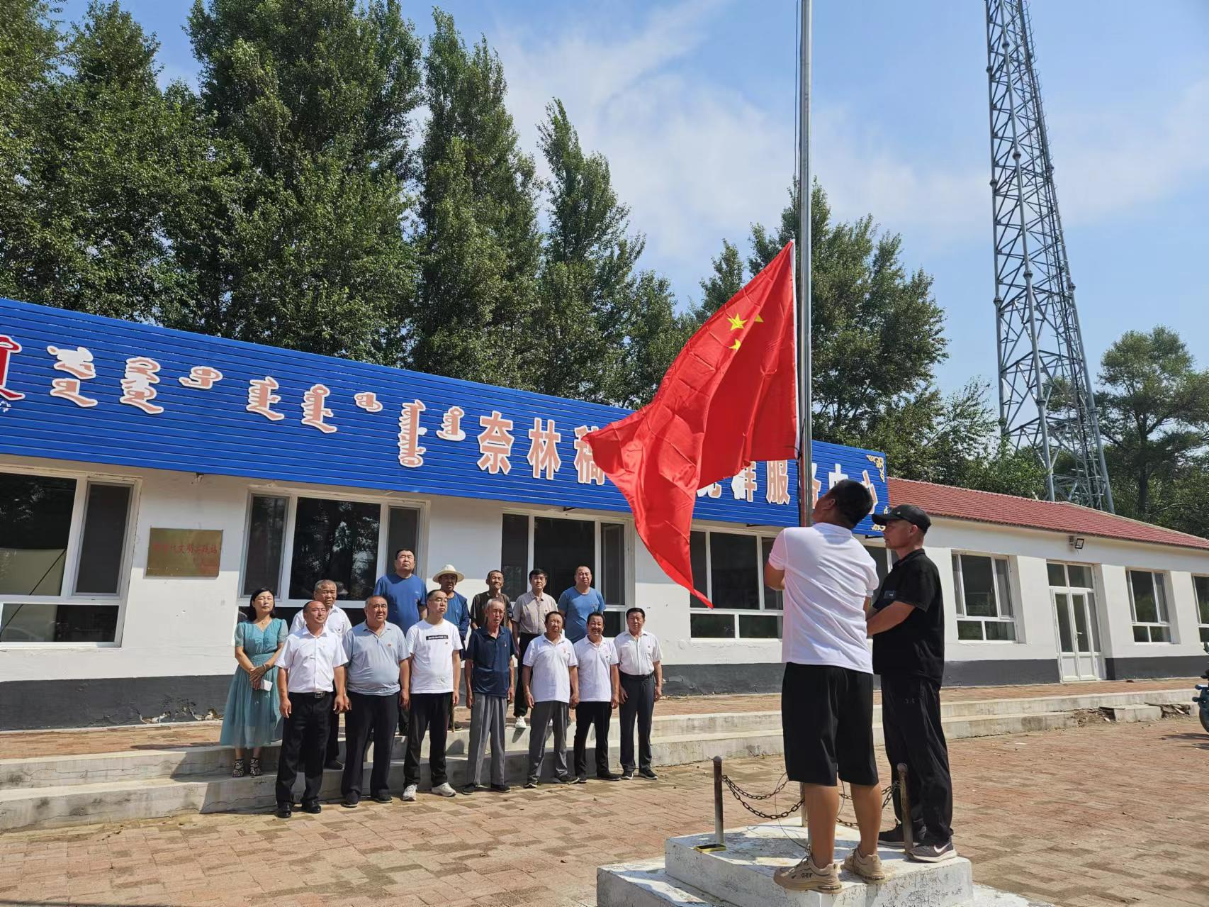 首先,在奈林稿嘎查村部,举行庄严的升国旗仪式,全体人员行注目礼,高唱国歌,目送五星红旗冉冉升起。