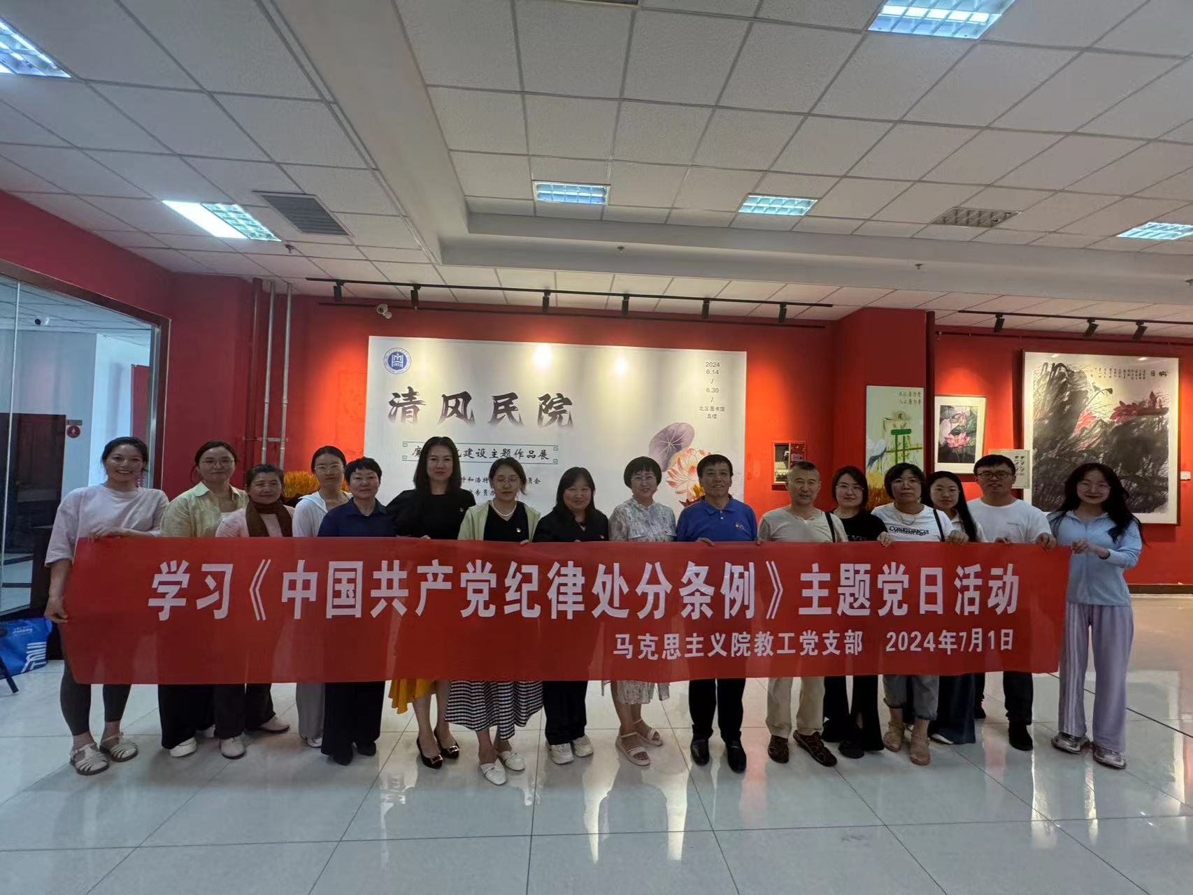 在中国共产党成立103周年之际,为推进支部党建工作,创新工作方式,提升党建工作水平,7月1日马克思主义学院教工党支部组织开展了以学习《中国共产党纪律处分条例》为主题的党日活动。此次活动旨在提高党员们的纪律意识,深化对党的纪律建设的认识,确保全体党员在思想上、行动上始终与党中央保持高度一致。