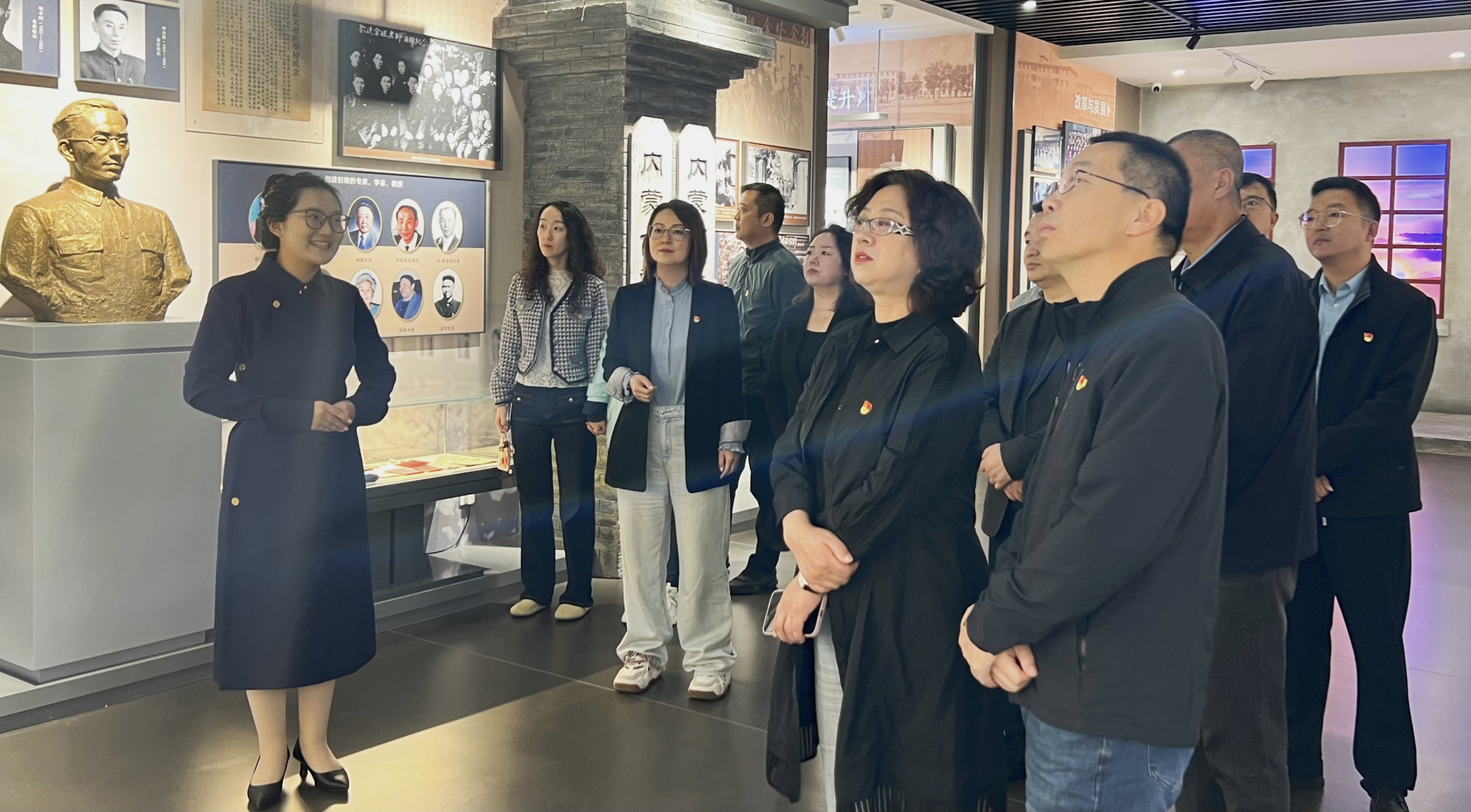 专业讲解员为党员干部们生动讲解了各个展区的内容,通过丰富多样的展板和珍贵的历史图片,带领大家穿越时空,重温了新中国波澜壮阔的发展历程。参观过程中,党员干部们不仅聆听了讲解,还积极参与互动,深刻体会到铸牢中华民族共同体意识对于维护国家统一、促进民族团结的重要意义。此次活动不仅是文学院与中共内蒙古自治区委员会党校深化合作、携手并进、共谋发展的重要举措,更是双方致力于进一步强化支部共建机制、深化交流互鉴与协同合作的具体体现。