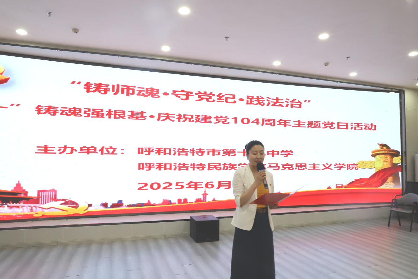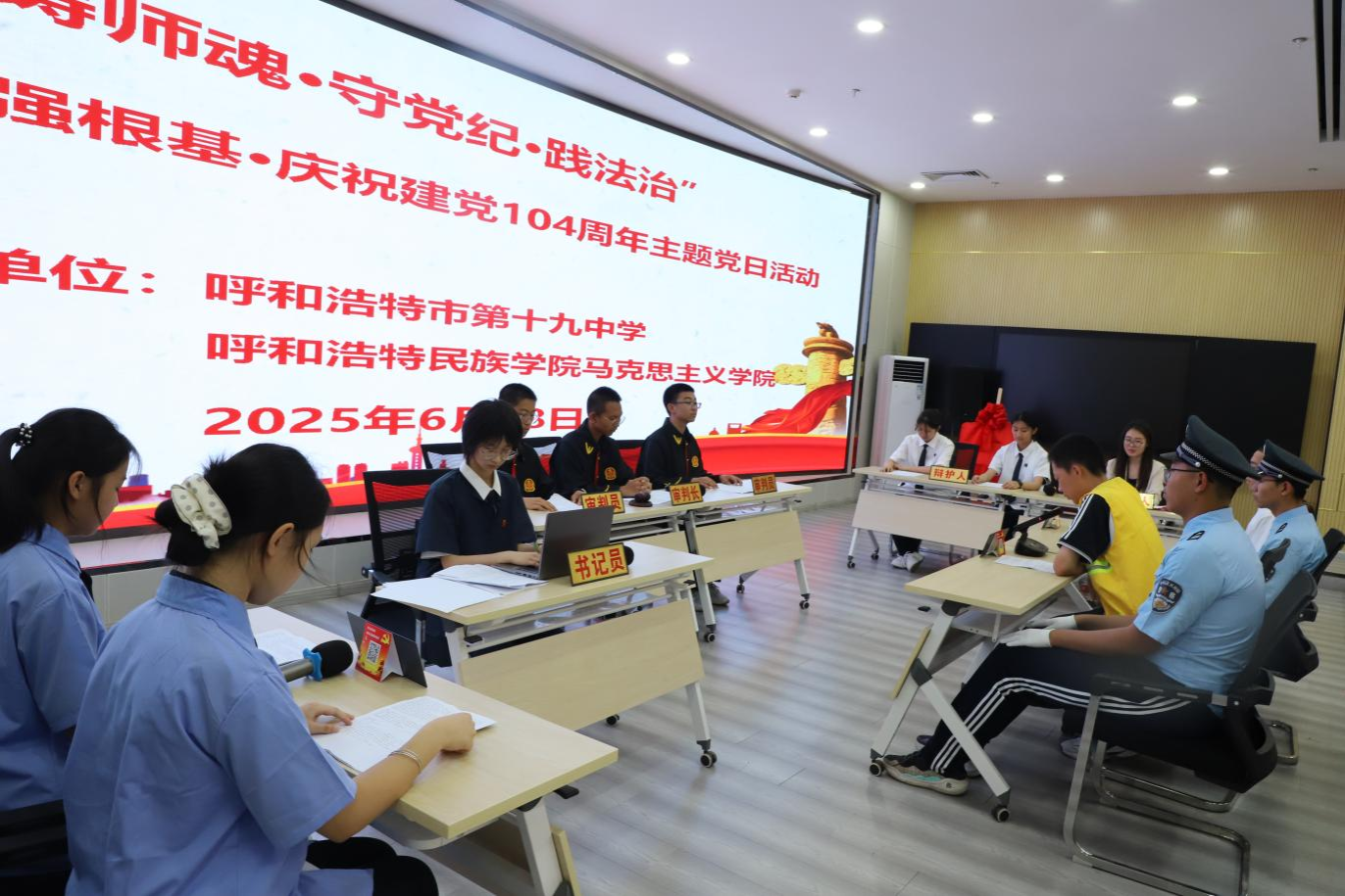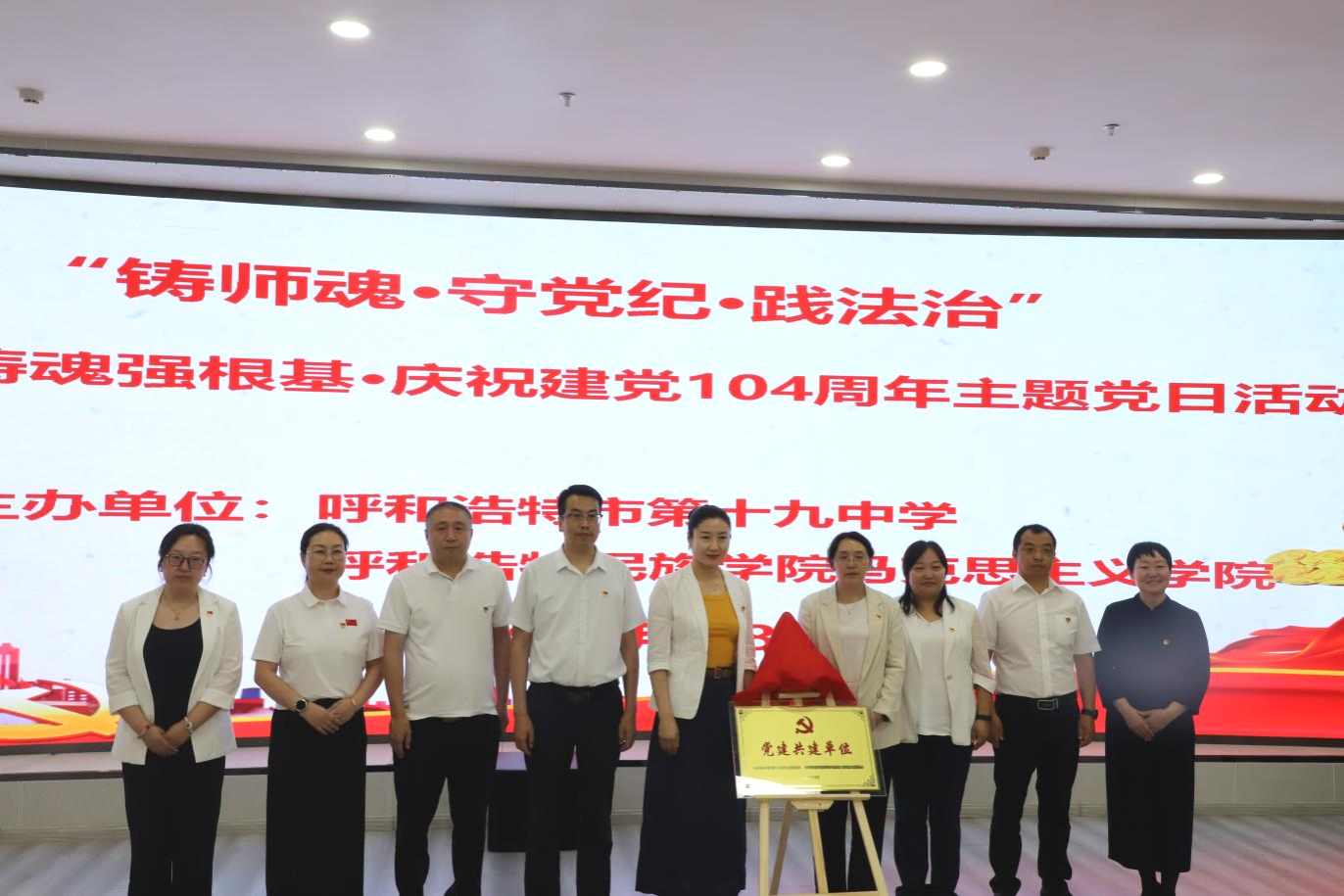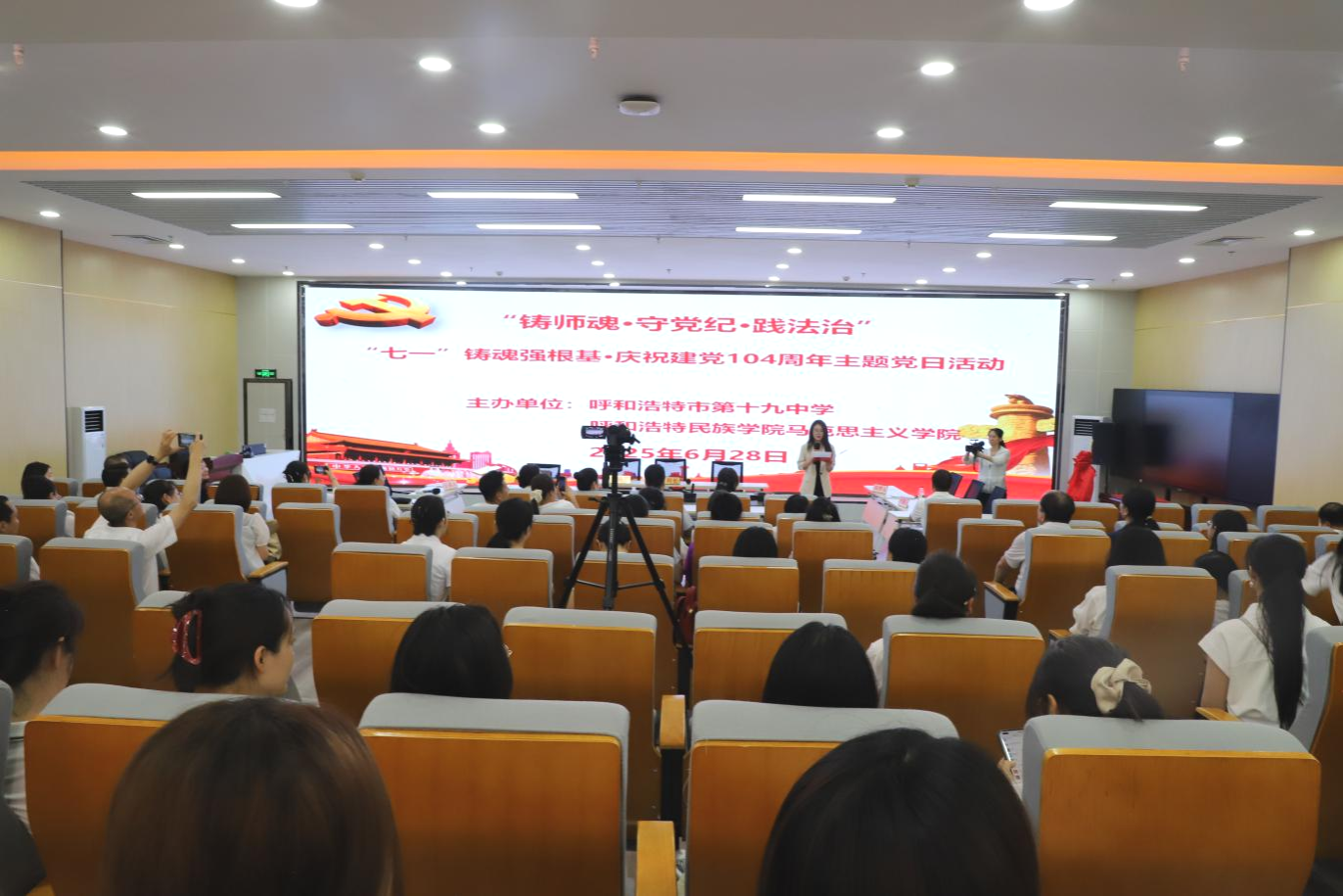 为庆祝中国共产党成立104周年,深化思想引领,推动党建与业务深度融合,6月28日,米乐官网统战部、马克思主义学院携手呼和浩特市第十九中学,联合开展“铸师魂 强根基 践法治”主题党日活动。来自三个单位及部门的党员教师、入党积极分子、思政名师工作室成员,以及团员、少先队员代表齐聚一堂,共同接受思想洗礼,凝聚奋进力量。