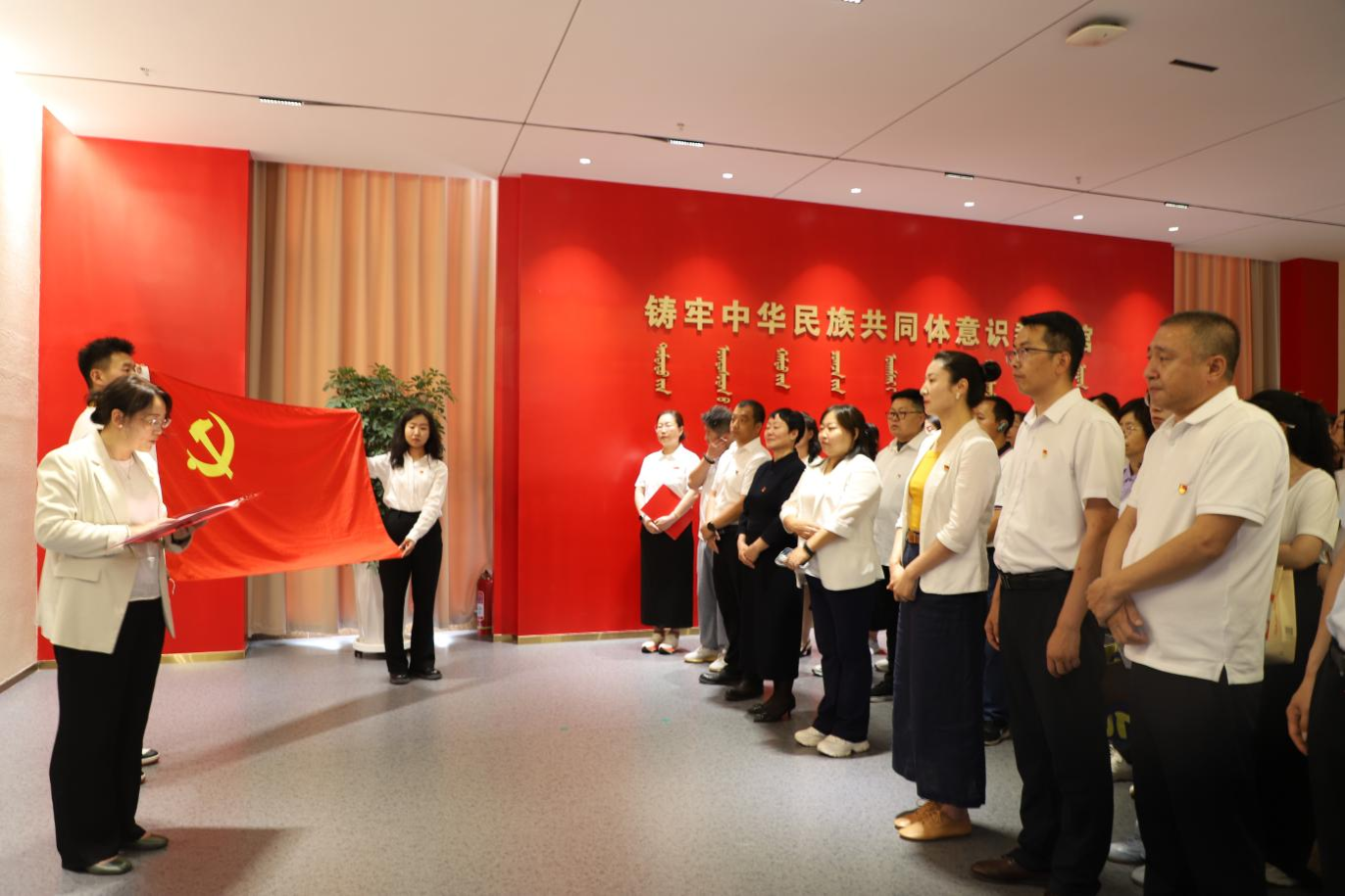 活动伊始,马克思主义学院书记吴美荣发表致辞。她指出,104年来中国共产党从南湖红船成长为领航巨轮,创造了辉煌成就,党员们应铭记历史、传承奋斗精神与初心使命。作为教育战线的党员,要深化理论研究,筑牢育人阵地,培育时代新人。她还对双方在党建联建合作提出期望,希望通过资源共享、课程共建、实践联动,将党建与教育教学深度融合,探索大中小学思政课一体化路径,共同为教育高质量发展贡献力量。致辞结束后,全体党员在铸牢馆门口整齐列队,面对鲜红的党旗,高举右拳,重温入党誓词。铿锵有力的誓言回荡在现场,每一位党员都神情庄重,眼神坚定,通过重温入党时的庄严承诺和坚定决心,进一步强化了身份意识和责任担当,筑牢政治忠诚的思想根基。