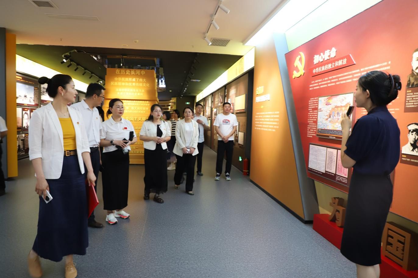 随后,在讲解员的引领下,众人有序走进铸牢馆参观学习。展馆内丰富的党史资料、珍贵的历史文物、生动的场景复原,全方位、多角度地展现了党的光辉历程和中华民族共同体意识的深厚内涵。本次活动还特别安排了少先队员进行宣讲,稚嫩却坚定的童声讲述着党史故事,让红色基因在代际传承中焕发出新的活力。参观过程中,大家认真聆听讲解,不时驻足凝视,在沉浸式的学习体验中深化主题教育学习成果,厚植爱党爱国情怀。