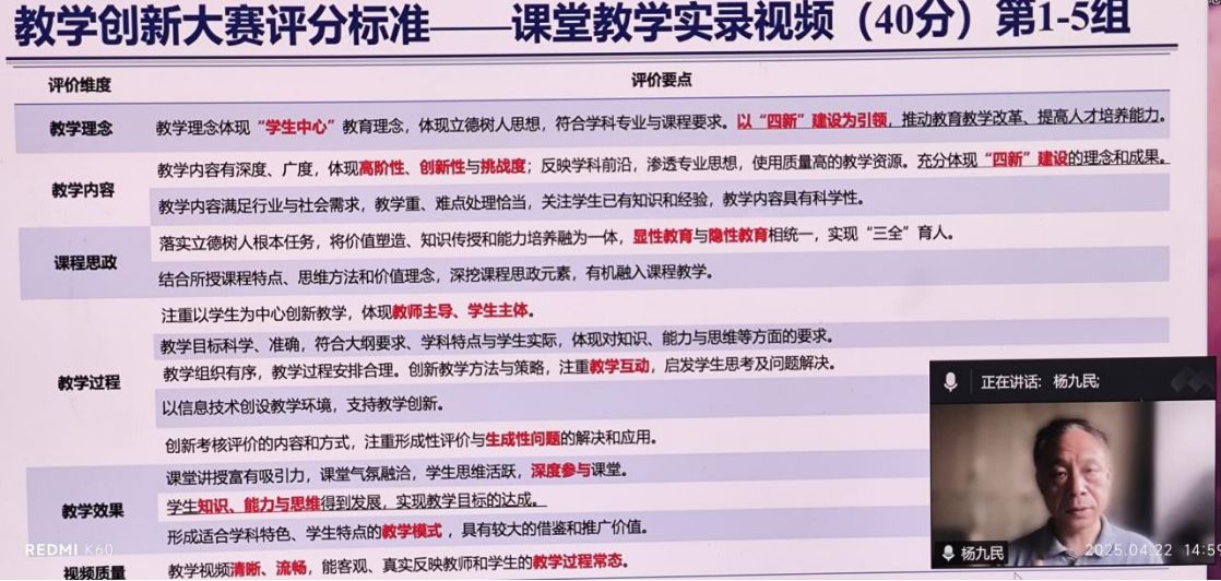 活动特邀华中师范大学教授杨九民以“教创赛注意事项解读分享”为题做讲座。杨九民深刻剖析国家及自治区大赛政策导向,以实例说明大赛对提升人才培养质量的作用,分析政策对参赛作品的教学理念、方法及评价的要求,助力教师把握方向。他指出在撰写创新报告时,注意创新点提炼要基于教学实际问题,兼具创新性、可行性与实效性,并阐述了报告各部分写作要点,展示范例让教师明确标准。针对现场汇报环节,杨九民分享了语言、肢体表达和时间把控技巧,以及制作PPT辅助汇报的方法。