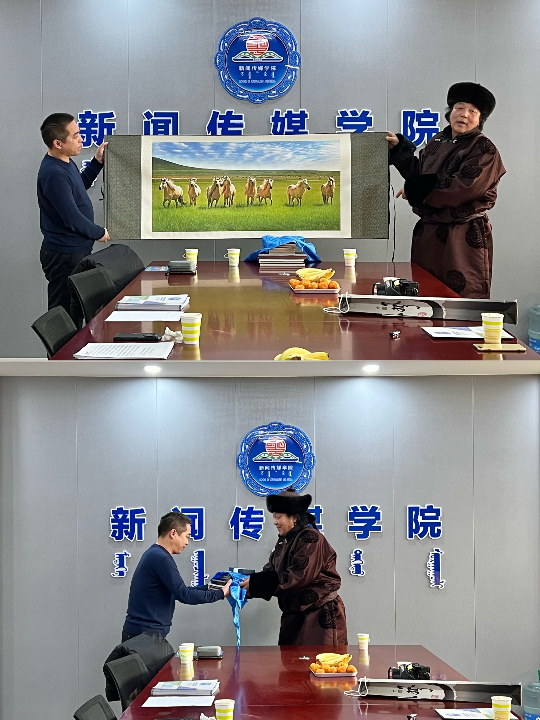 12月26日,新闻传媒学院荣休教师巴拉吉、巴图那顺携90级和96级播音班校友来校,向学院赠予纪念礼物并开展座谈交流,学院领导班子及播音与主持艺术教研室教师参与座谈。