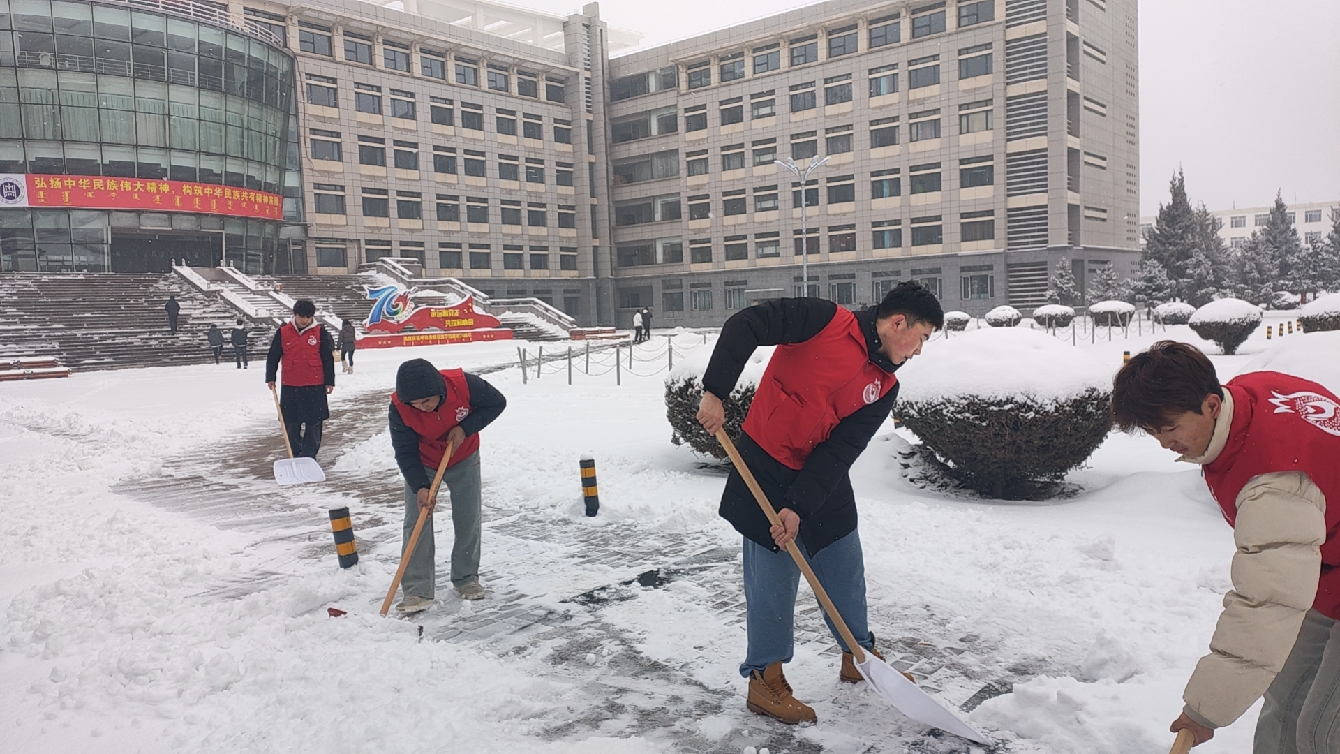 落白寒人,除雪暖心。在老师的带领下,志愿者们手持扫帚与雪铲等工具,全身心投入到扫雪除冰工作中。他们克服寒风、低温,高效配合,团结一致,以极大的热情与动力将厚厚的积雪清理到道路两侧,成功扫除了尚智楼门前及周围的积雪,为大家清理出宽敞干净的通行之路。