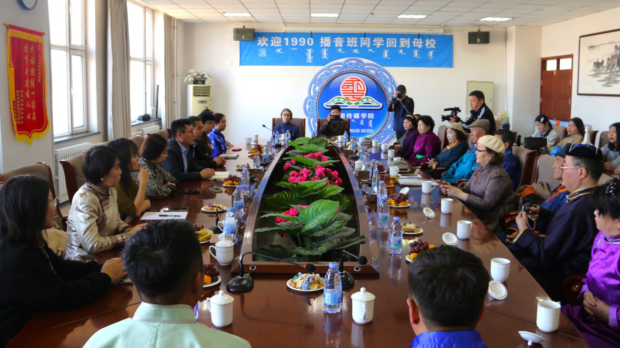 10月21日,新闻传媒学院1990级播音班校友在班主任巴图那顺老师的带领下荣归母校。学院领导班子携播音与主持艺术专业全体教师以崇高的礼仪迎接校友们的到来。看到旧时的师友和学院的新颜,老前辈们不禁感慨落泪,相互问安和表达感谢。