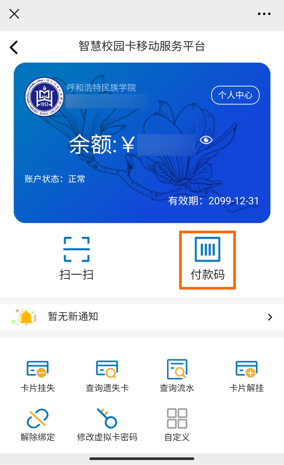 打开“付款码”(二维码),对准身份识别设备摄像头,完成身份识别。身份识别设备读取付款码不扣取费用。