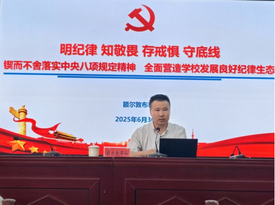 6月30日上午,在办公楼4楼会议室,学校党委委员、副校长额尔敦布和同志以“明纪律 知敬畏 存戒惧 守底线 锲而不舍落实中央八项规定精神 全面营造学校发展良好政治生态”为主题,为分管领域全体党员领导干部讲授专题党课,并就暑期重点工作进行部署。