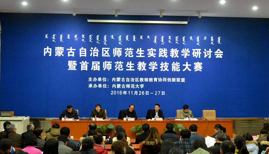 2016年11月26日,由内蒙古自治区教师教育协同创新联盟主办、内蒙古师范大学承办、北京师范大学出版社、高等教育出版社和中教启星科技股份有限公司协办的内蒙古自治区师范生实践教学研讨会在内蒙古师范大学举行,全区具有师范类专业的8所院校领导、专家及参加自治区首届师范生教学技能大赛的领队、指导教师和参赛选手共400余人参加本次会议,米乐官网副院长阿拉坦仓教授和额尔敦布和教授参加研讨会,阿拉坦仓教授主持开幕式。
