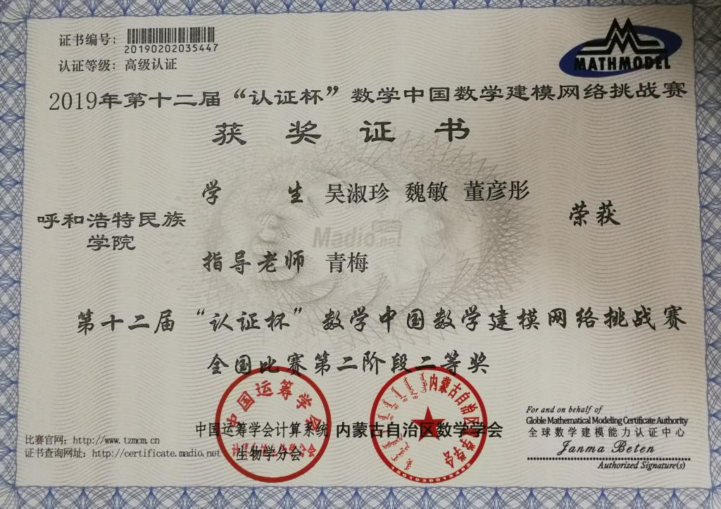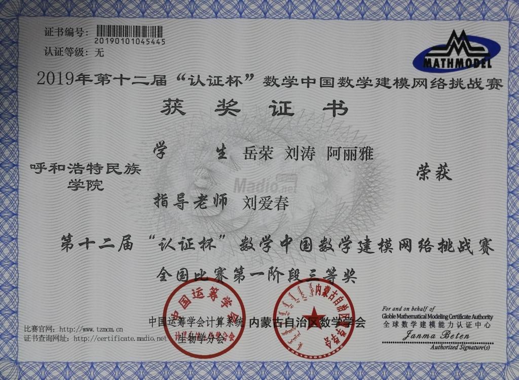 米乐官网数学与大数据学院参赛队在2019年“认证杯”数学中国数学建模网络挑战赛先后于4月份和5月份两阶段分别为3972,1638支参赛队中竞赛取得2个二等奖,5个三等奖以及3个优秀奖的好成绩。“认证杯”数学中国数学建模网络挑战赛是由内蒙古自治区数学学会主办面向全国的比赛,由刘爱春、高晶英和青梅三位博士担任指导教师。
