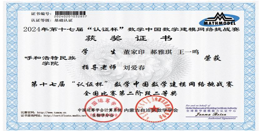 “认证杯”数学中国数学建模网络挑战赛是面向全国各高校大学生开展的一项赛事,也是全国大学生五大类竞赛之一的“高教社杯”全国大学生数学建模竞赛赛前的训练机会。通过组织学生参加此项比赛,激发了学生的学习数学、软件等知识和对现实问题深入探究的兴趣,促进了学生学以致用,有效助力力提升和发挥学生沟通协作、文献查阅、写作等综合能力。