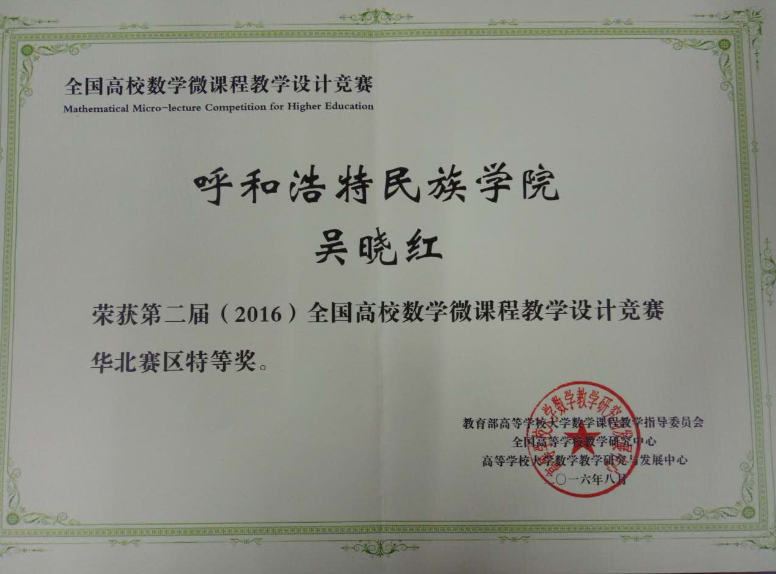第一、二届全国高校数学微课程教学设计竞赛获奖证书
