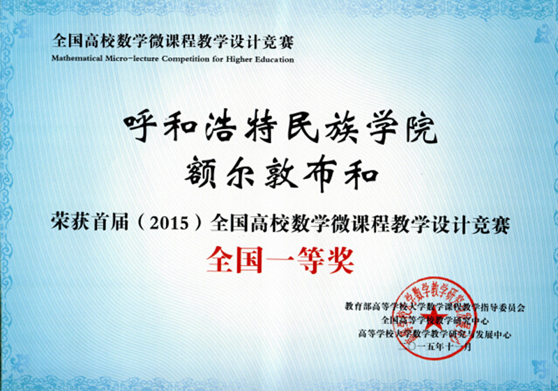 此前,额尔敦布和教授曾经荣获自治区高等学校青年教师课堂技艺大赛(2001年、2007年)二等奖两次、全国民族院校数学观摩课比赛(2012年)三等奖一次和首届全国数学微课程教学设计竞赛华北赛(2015年)区特等奖一次。(2015.11.10)