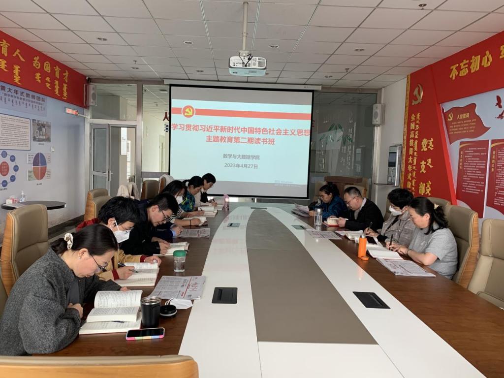 4月27日下午,数学与大数据学院党总支在综合楼807黄大年式教师团队党支部活动室举办学习贯彻习近平新时代中国特色社会主义思想主题教育第二期读书班。党总支副书记郝喜凤主持会议,副院长额尔敦其其格以及全体教工党员参加会议。