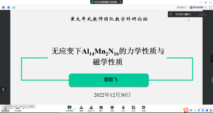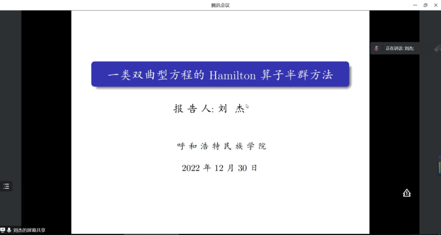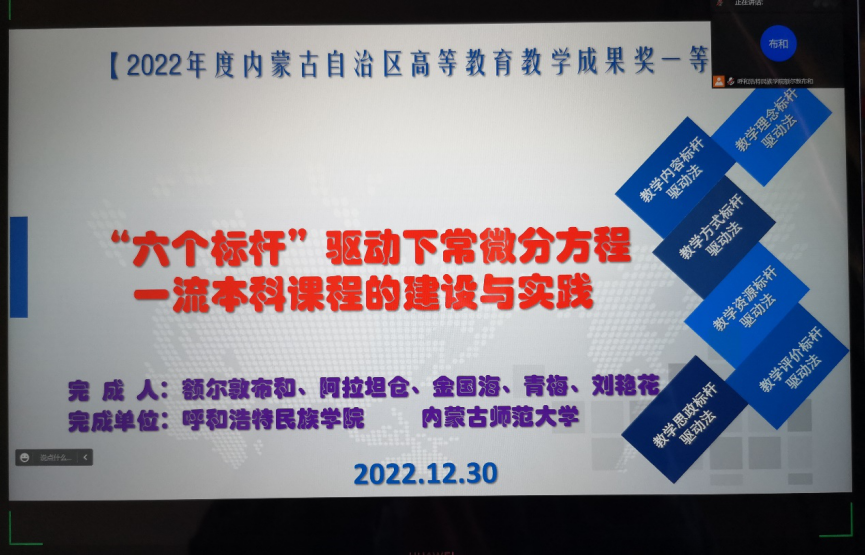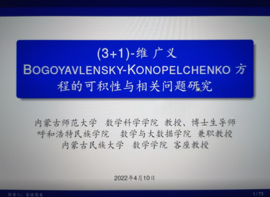 上午,由何吉欢教授和套格图桑教授分别作了 “数学思维与科学前沿”和“(3+1)维广义Bogoyavlensky- Konopelchenko方程的可积性与相关问题研究”为主题的专题报告,额尔敦布和教授主持。下午,首先额尔敦布和教授围绕获得的2022年内蒙古自治区高等教育教学成果一等奖成果,作了“‘六个标杆’驱动下常微分方程一流本科课程的建设与实践”为题目的报告;然后,刘杰副教授、董鹏飞博士、刘爱春博士和何斯日古楞副教授依次作了学术报告,涉及Hamilton算子的生成半群问题、Al14Mn2N16力学性质与磁学性质、算子矩阵谱理论和混合有限元法等多方面内容。本次论坛内容丰富,覆盖面广泛,教师们交流充分,相互启发,为下一步作教学研究和科学研究打下了良好的基础。