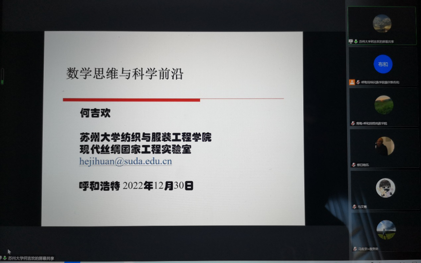 2022年12月30日,米乐官网全国高校黄大年式教师团队线上举办了2022年度教学科研论坛。团队特别邀请苏州大学博士生导师何吉欢教授和内蒙古师范大学博士生导师套格图桑教授作专题报告,教务处处长额尔敦布和教授、数学与大数据学院副书记郝喜凤、副院长额尔敦其其格和团队全体成员、研究生及高年级本科生共120余人参加本次论坛。