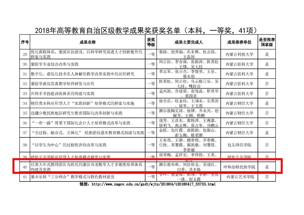 1. 教学成果:内蒙古自治区教育厅关于对2018年高等教育自治区级教学成果奖名单进行公布的通知(一等奖)(负责人:额尔敦布和)