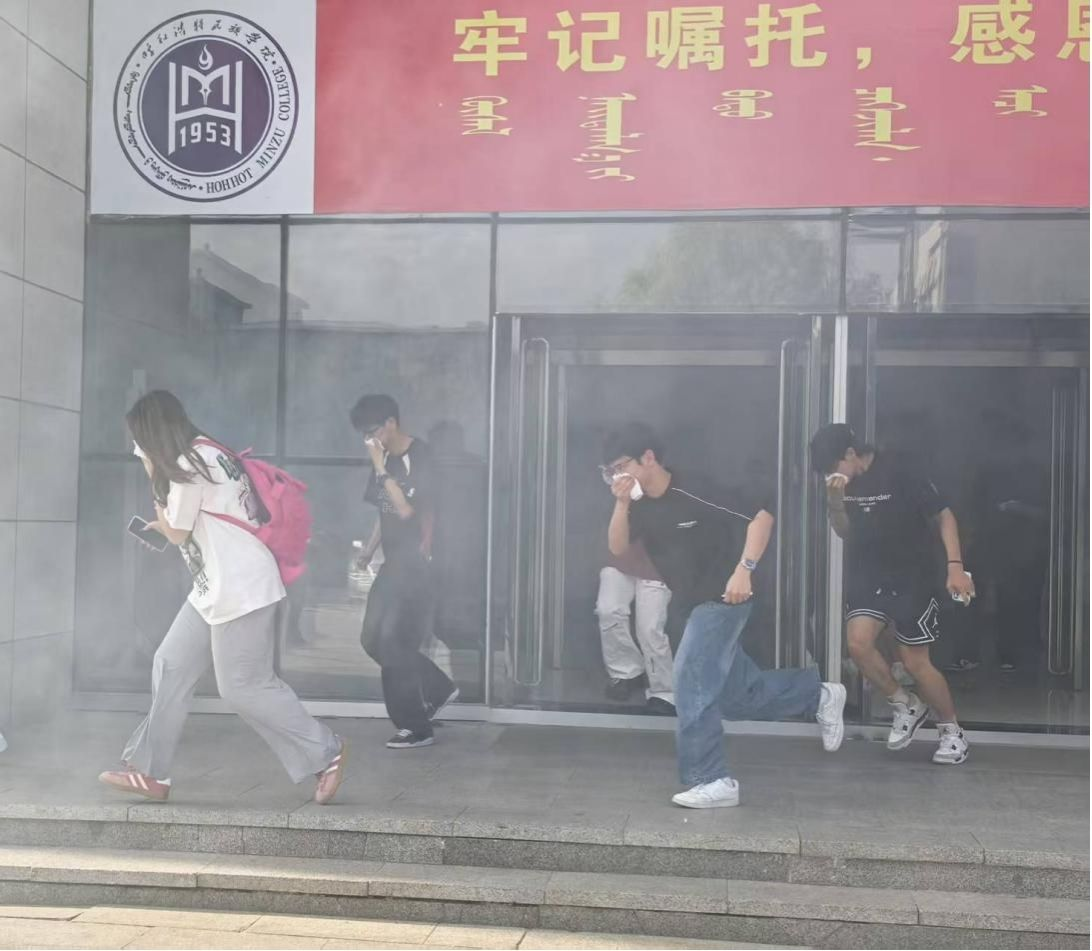 在综合楼模拟火灾进行逃生演练,警报声响起后,师生们迅速按照应急预案要求,用湿毛巾捂住口鼻,弯腰低姿,沿着预定疏散路线有序撤离实验室。