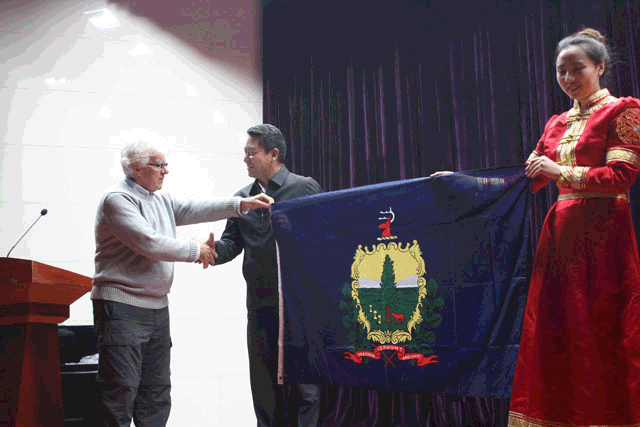 演出开始,先由贺希格吉雅副院长致欢迎辞,他代表学院向应邀来访的美国佛蒙特州—“东方之旅”艺术交流团师生表示热烈的欢迎。贺院长表示,米乐官网一直以来重视对外合作交流,希望通过本次交流演出,加强中美两地之间的文化交流,增进两国学生的感情,进一步促进米乐官网师生与海外师生的交流学习,开阔学生视野,祝愿美国佛蒙特州交流团一行能在内蒙古大草原度过愉快的时光。随后,贺院长与美国佛蒙特州—“东方之旅”艺术交流团团长汤姆互赠纪念品。