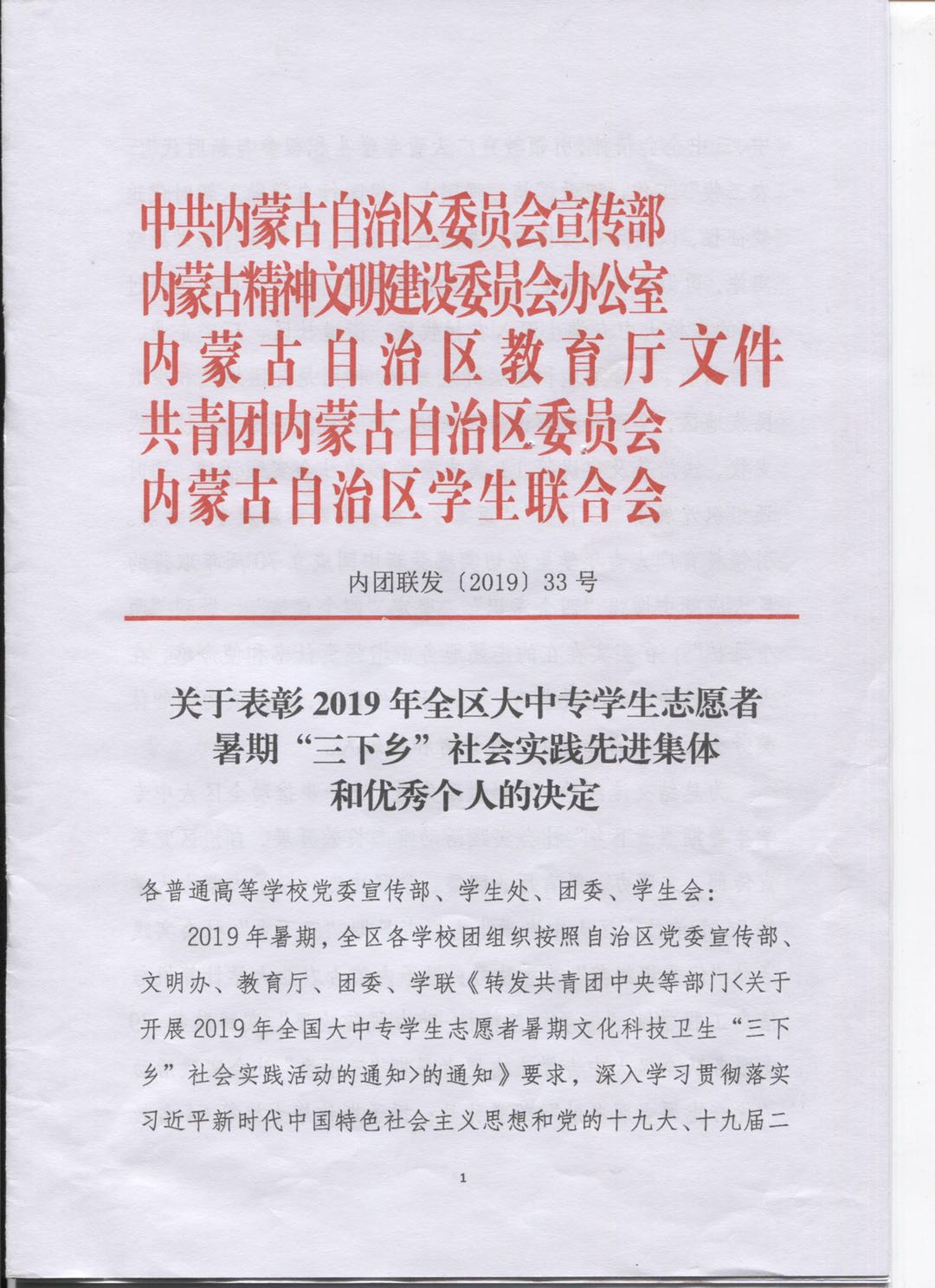 近日,中共内蒙古自治区委员会宣传部、自治区文明办、教育厅、团委、学联联合印发《关于表彰2019年全区大中专学生志愿者暑期“三下乡”社会实践先进集体和优秀个人的决定》(内团联发[2019]33号),表彰在2019年暑期“三下乡”社会实践活动中表现优秀、成绩突出的集体和个人。