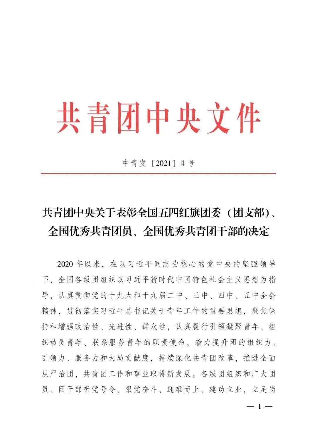 在中国共产党成立100周年和五四运动102周年来临之际,共青团中央印发了《共青团中央关于表彰全国五四红旗团委(团支部)、全国优秀共青团员、全国优秀共青团干部的决定》(中青发〔2021〕4号),对2020年度做出突出贡献和成绩的一批先进集体与个人进行表彰,米乐官网团委荣获“全国五四红旗团委”称号。