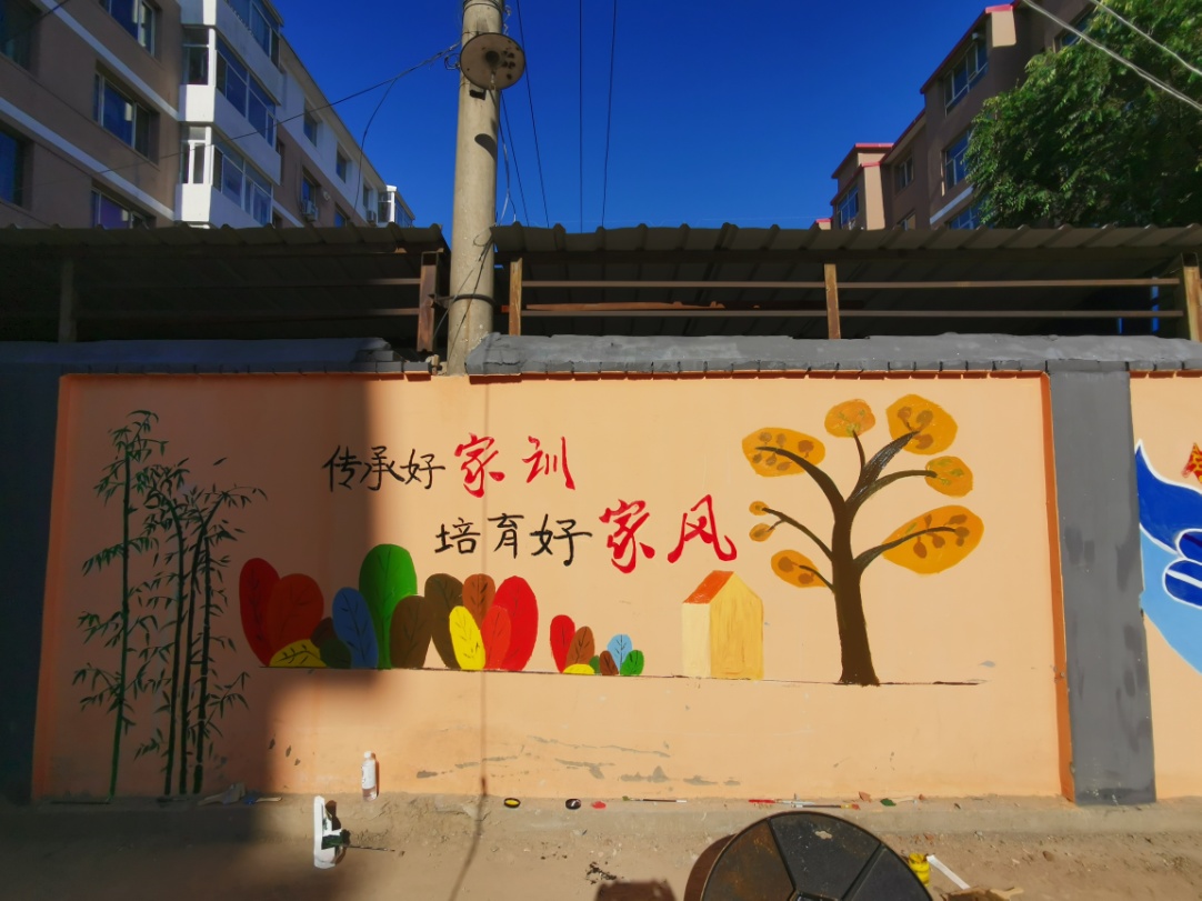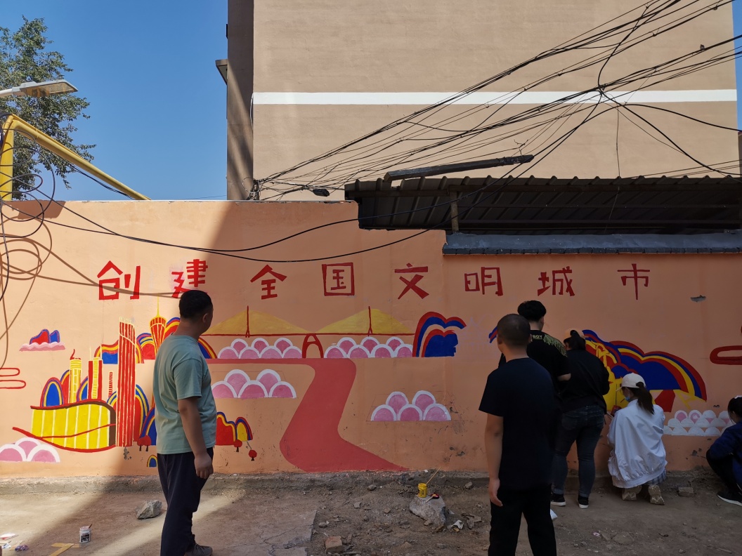 师生们走进金属小区制作墙体公益广告,在老师的指导下,划分5组对10面墙体进行了总体分工,确定了创作内容。同学们围绕民族团结、尊老爱幼、保护环境、共创文明城市等公益主题进行构思并展开创作。经过10多个小时的辛苦创作,一幅幅作品徐徐展开,美轮美奂,装点出小区文明和谐的文化氛围,受到了小区居民的高度赞扬。