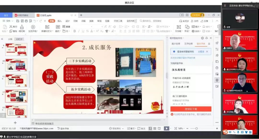 为进一步深化共青团改革,落实全面从严治团要求,根据共青团中央《基层团组织书记述职评议考核暂行办法》和自治区团委相关要求,1月4日上午,学校团委通过腾讯会议形式召开了2022年度团总支书记抓基层团建工作述职评议会,团委全体教师、各二级学院团总支书记(负责人)参加了述职评议会,团委副书记白银亮主持。