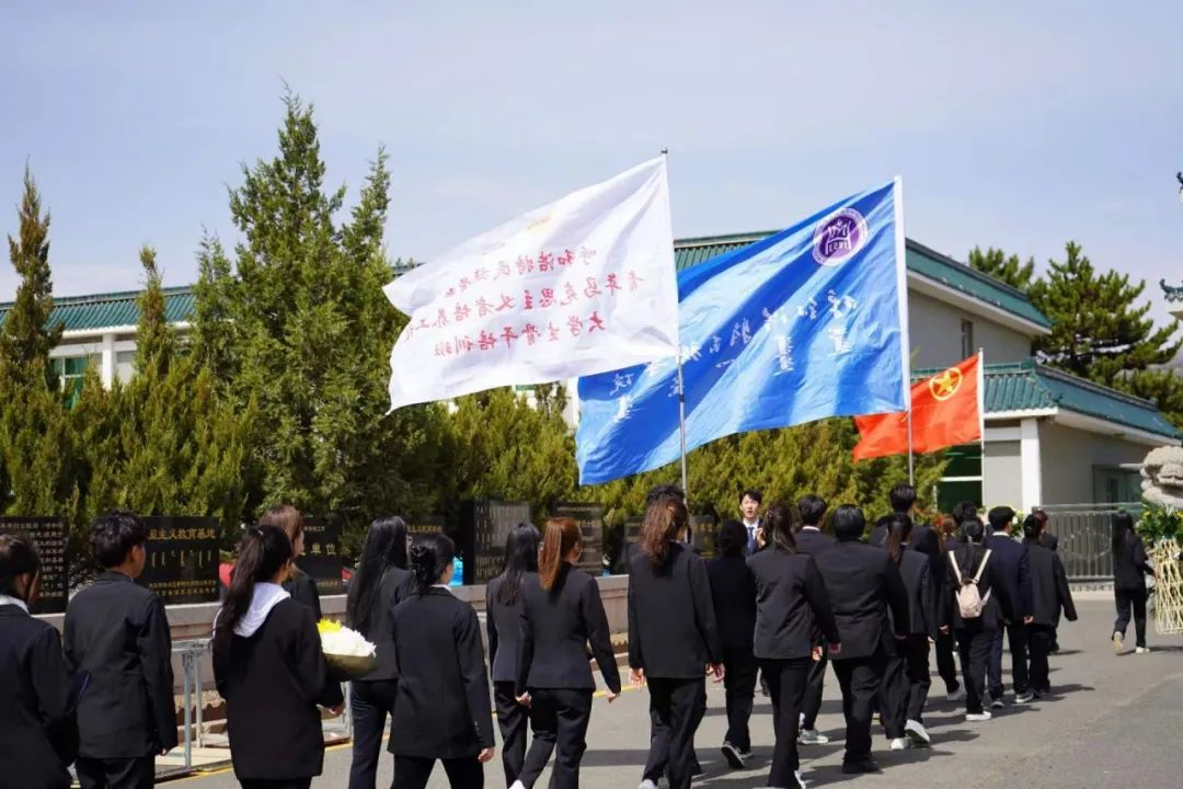 在庄严肃穆的烈士纪念碑前,全体师生整齐列队,向英烈们敬献鲜花,肃立默哀,深切表达对革命先烈们的追思之情。随后,师生们以深情的朗诵表达对烈士们无尽的哀思与怀念。