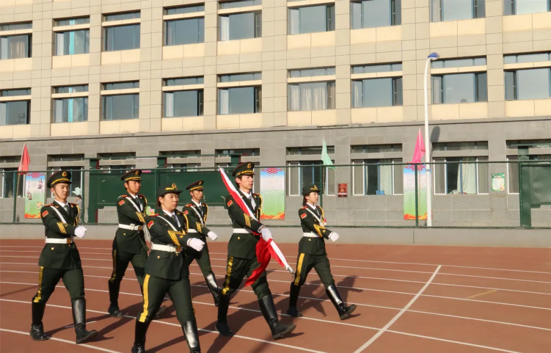 7点整,升国旗仪式正式开始。英姿勃发的国旗护卫队,步伐铿锵有力,护送着五星红旗正步走向旗杆,全体师生面向国旗肃立致礼。随着激昂高亢的《义勇军进行曲》奏响,鲜艳的五星红旗迎着旭日的光辉冉冉升起,在熠熠晨光中迎风飘扬。