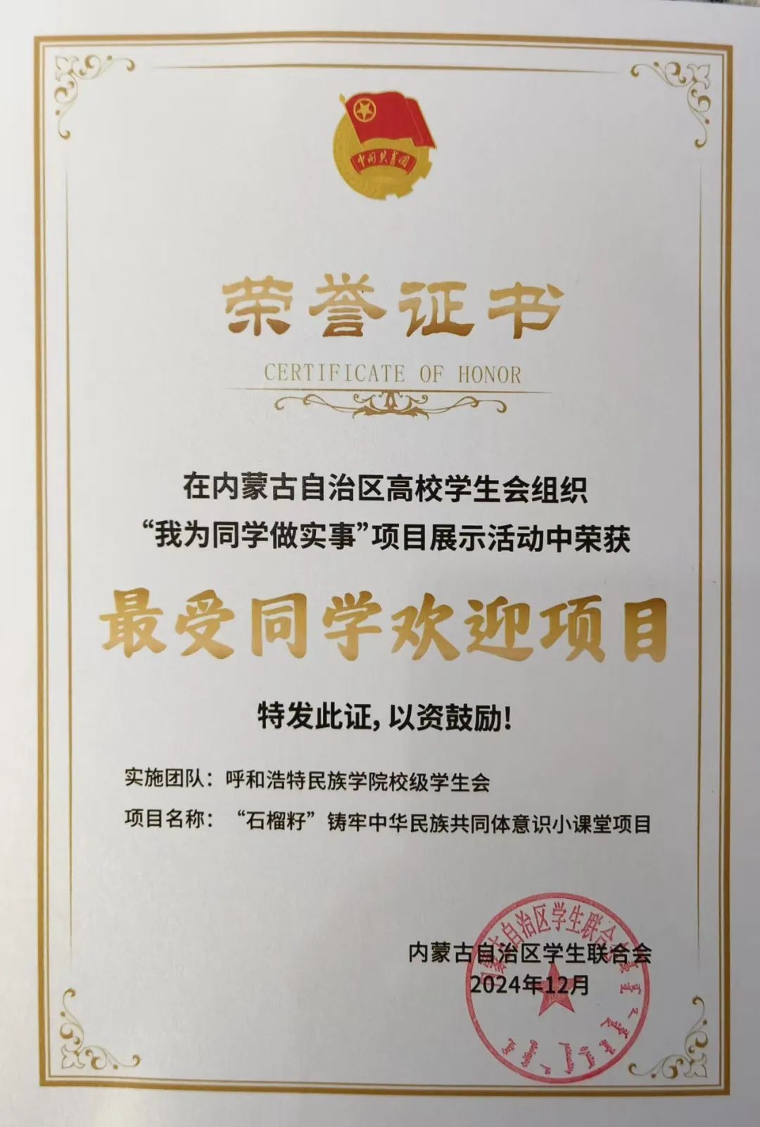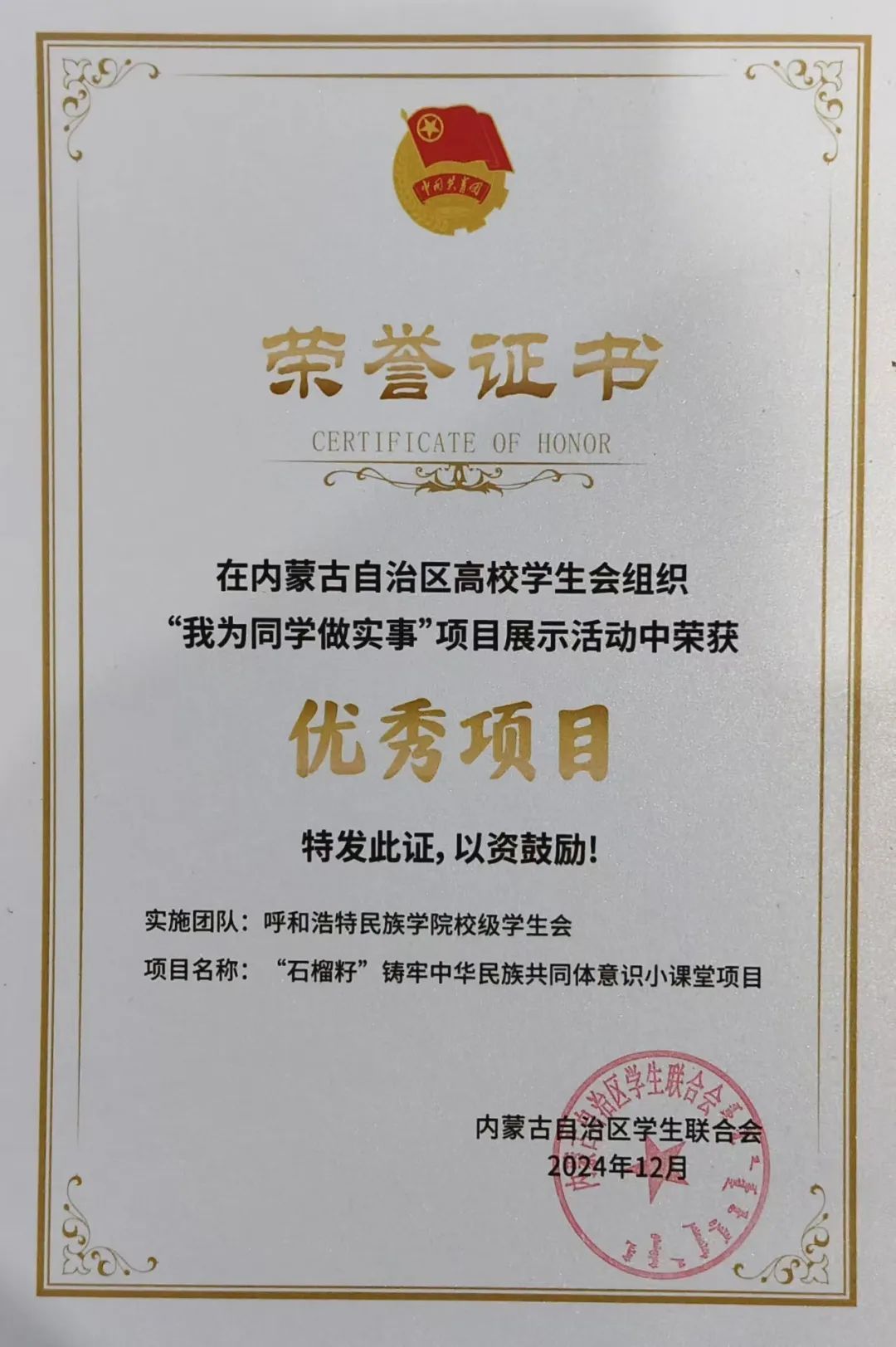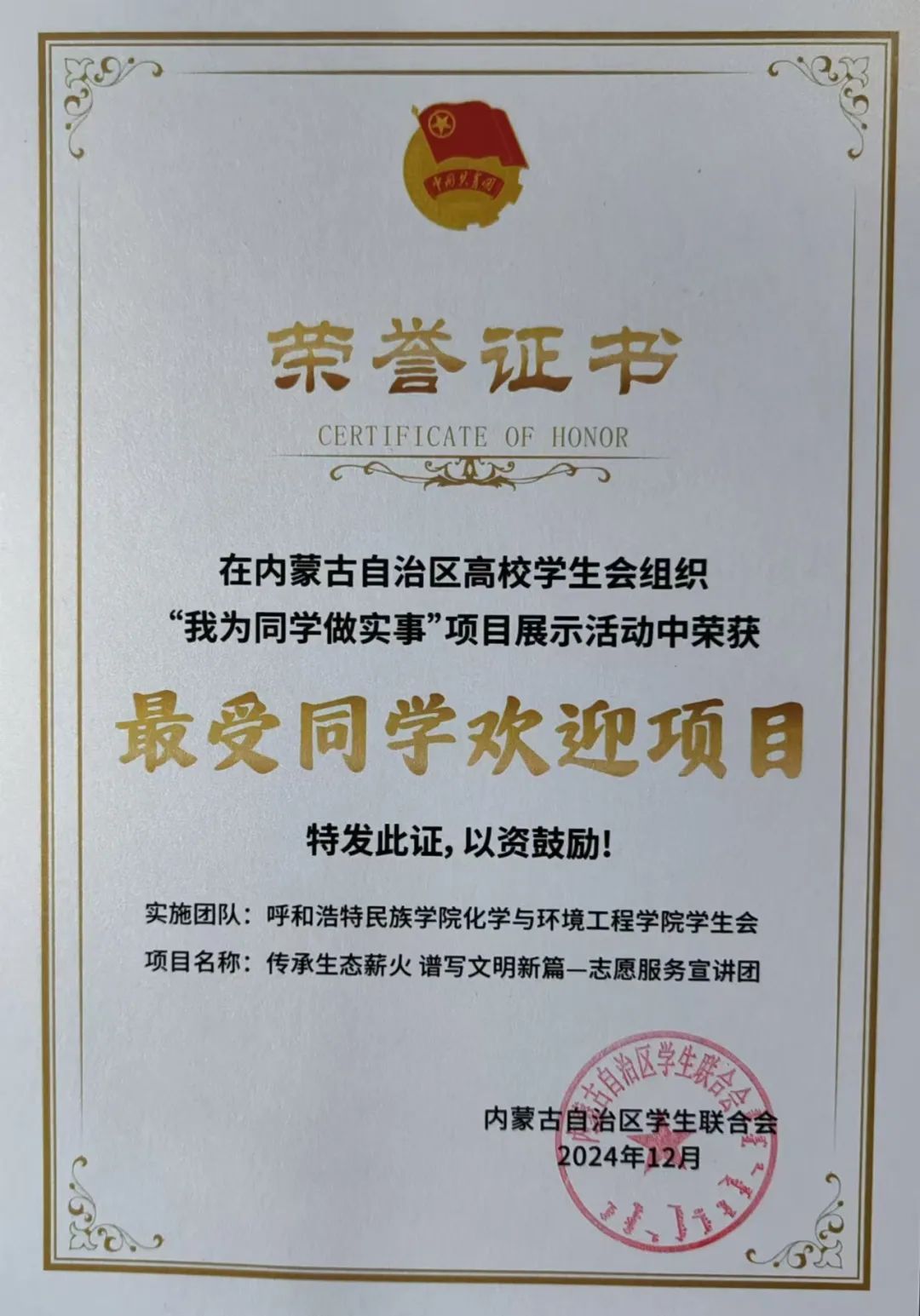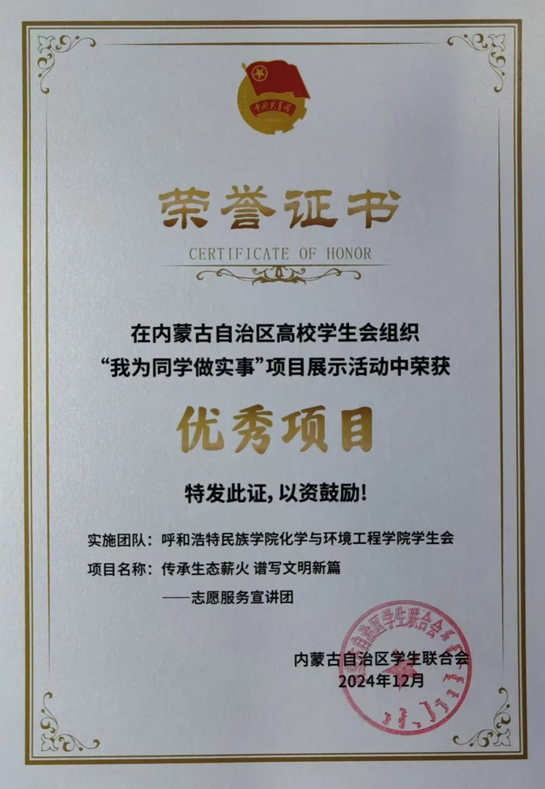 12月6日至7日,内蒙古自治区高校学生会组织“我为同学做实事”项目展示交流活动圆满落幕。经米乐官网各级学生组织积极申报、自治区团委、学联审核,米乐官网学生会申报的“‘石榴籽’铸牢中华民族共同体意识小课堂”项目以及化学与环境工程学院学生会申报的“传承生态薪火谱写文明新篇——志愿服务宣讲团”成功入围。