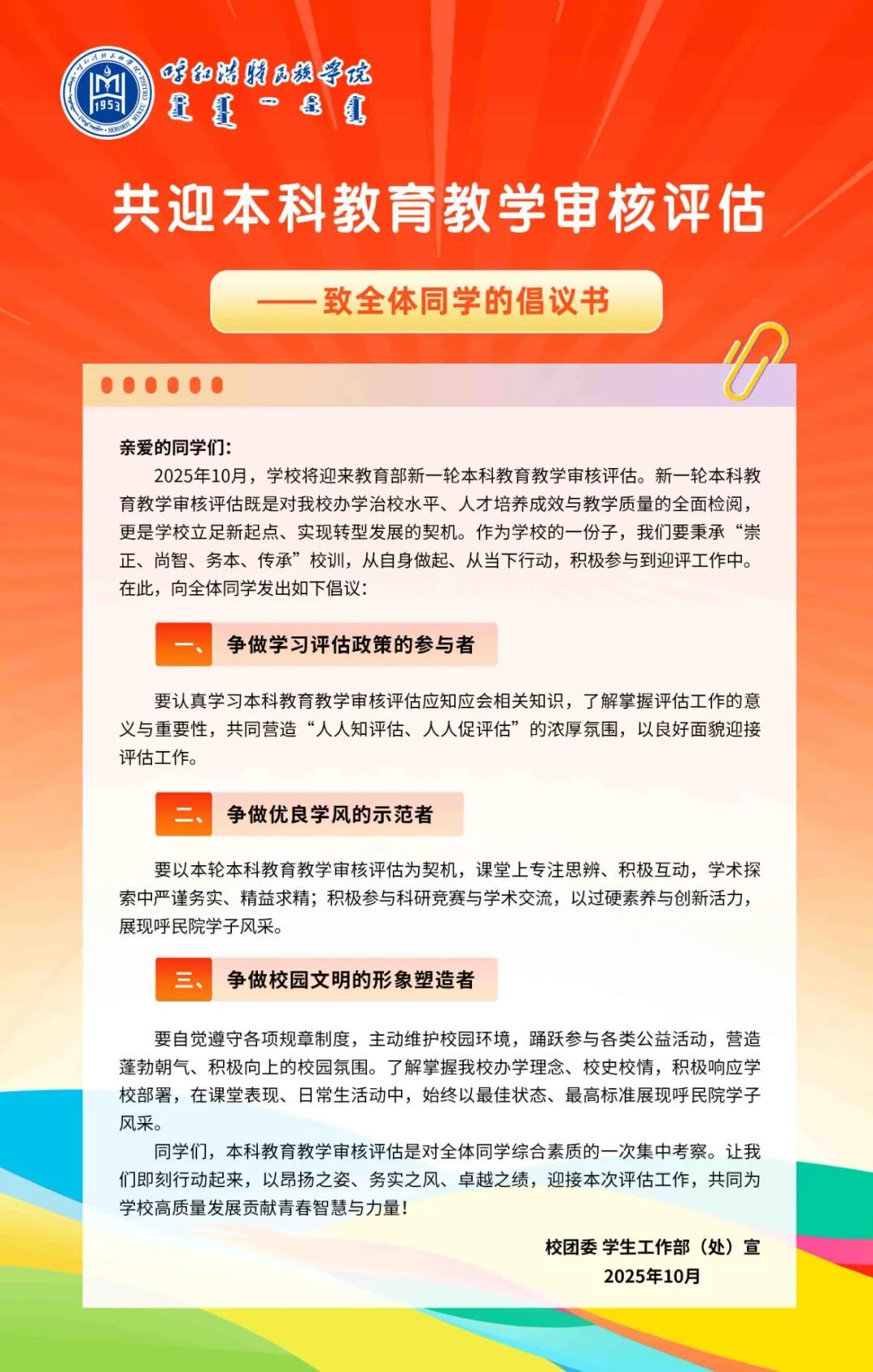 共迎本科教育教学审核评估——致全体同学的倡议书