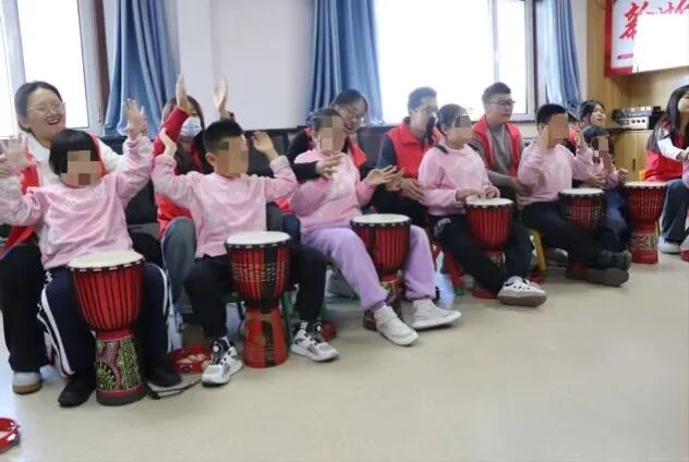 活动分三阶段推进:预热环节,志愿者讲述《我爸爸》等情绪主题故事,引导孩子感知情感,再通过蜡笔画创作、趣味舞蹈互动拉近距离;随后陪同孩子进行非洲鼓练习,以韵律滋养心灵;尾声以舞蹈互动定格暖心时光。