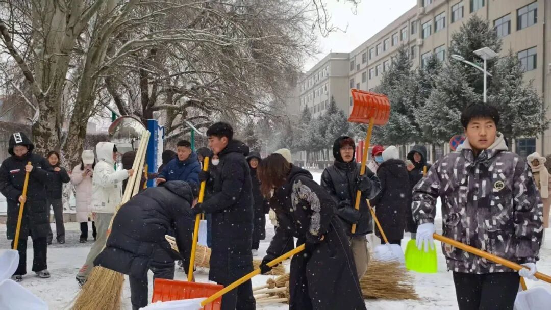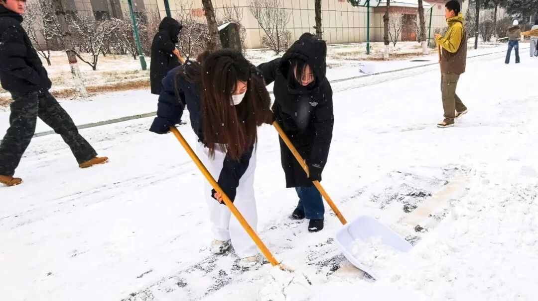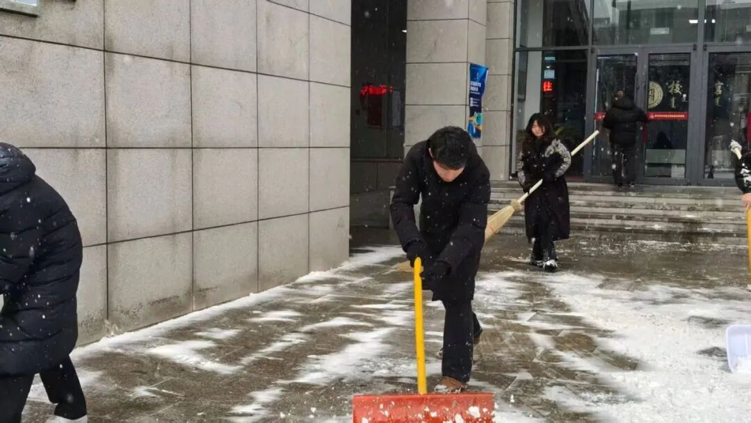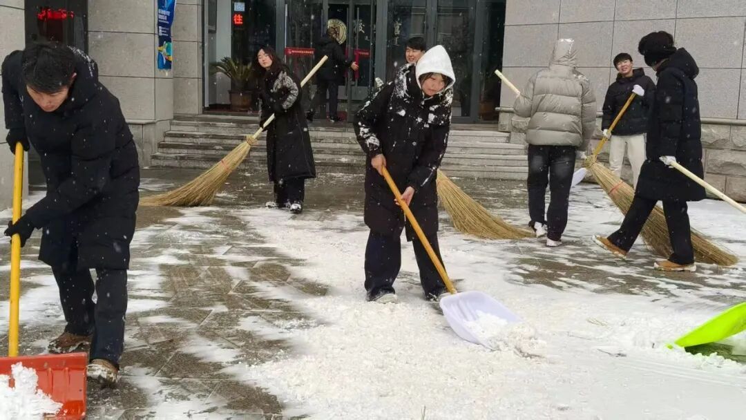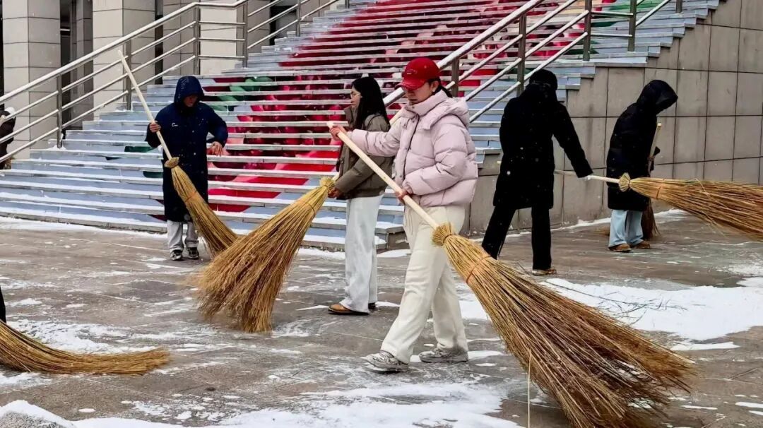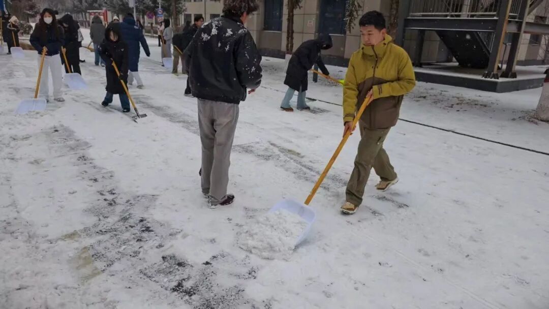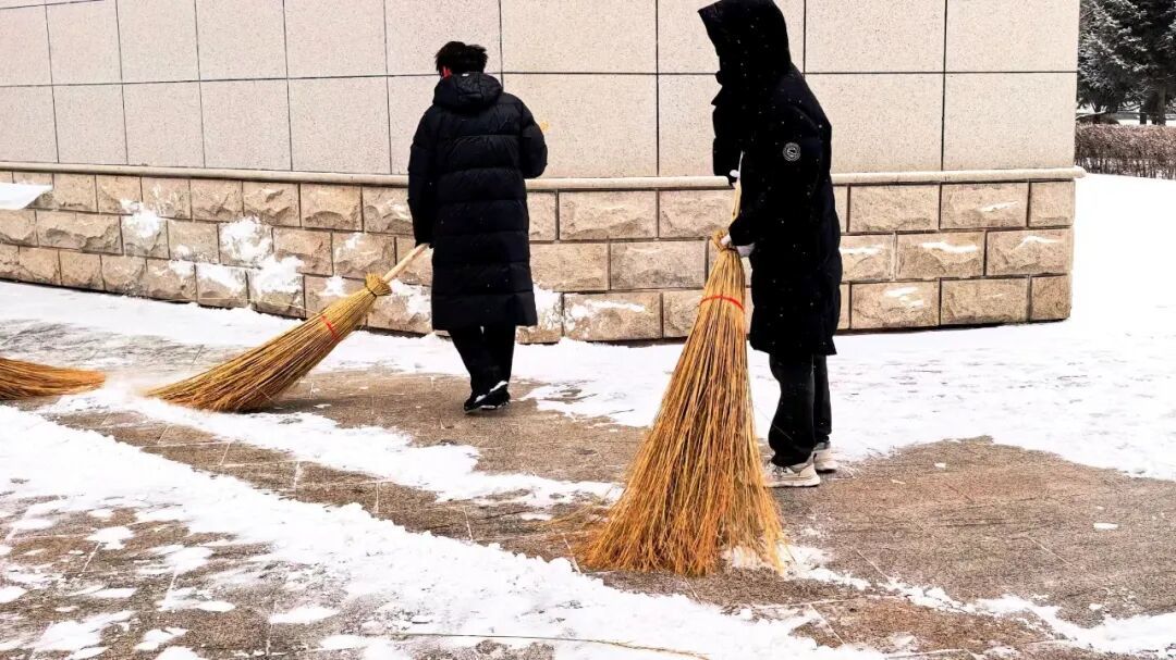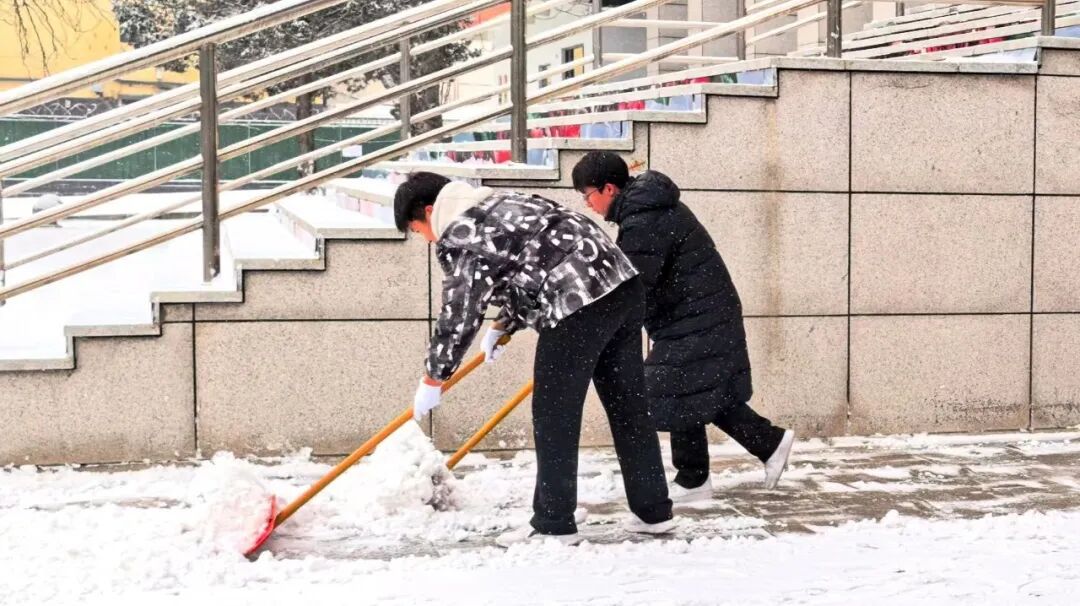 清扫现场,全体人员干劲十足、分工协作。大家手持铁锹、扫帚等工具,扫雪、除冰、运雪各环节衔接有序,配合十分默契。即便面对刺骨的冷风,双手冻得通红,大家依旧热情不减,一刻也未曾停下手中的动作。经过一番努力,楼前地面积雪被彻底清扫干净,为全校师生的出行带来了便利。