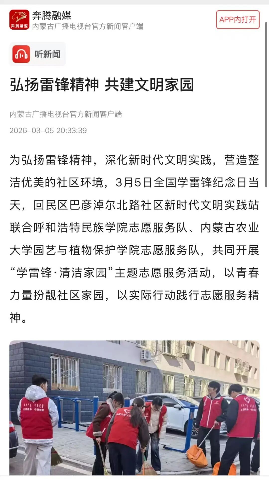 活动期间,米乐官网志愿者积极开展社区环境整治、敬老助老等志愿服务,用实际行动践行奉献、友爱、互助、进步的志愿精神。米乐官网4 名志愿者应邀参加内蒙古电台 “我爱公益” 节目直播采访,相关活动获奔腾融媒内蒙古广播电视台官方新闻客户端专题报道。