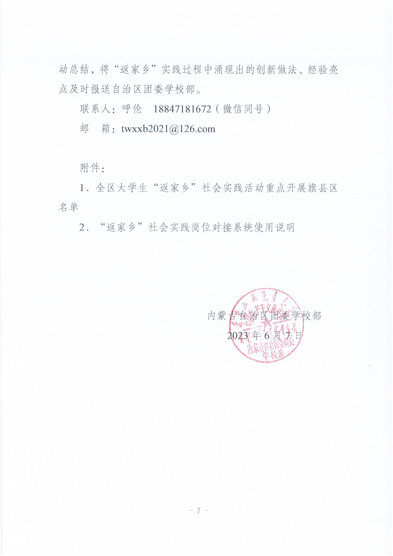 关于开展内蒙古2023年全区大学生“返家乡”社会实践工作的通知