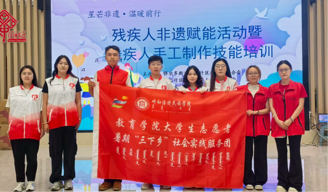教育学院组织47名师生志愿者,分成5支小队奔赴乌兰察布、赤峰、通辽等5个盟市,开展推普教学、民族团结教育、助残服务等多元实践。在兴安盟福康颐养院,团队通过情景教学帮助老年人提升普通话应用能力;在哈民遗址,开展文化研学强化中华民族共同体意识;在鄂尔多斯“星芒非遗”活动中,以非遗赋能助力残疾人社会融入。活动累计服务群众超800人次,获地方单位高度评价。