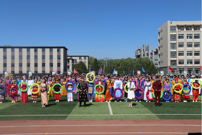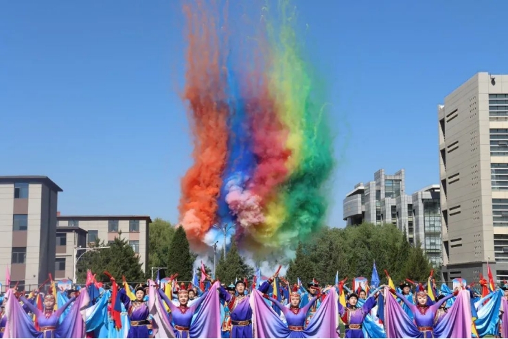 筷子清脆的打声与舞动的裙摆交相辉映,同心圆的环绕象征着各民族同伴百花齐放、团结一心的美好画面,也是对“崇正 尚智 务本 传承”校训的积极践行,更是对中华民族传统文化的致敬,精彩相逢,终有尾声,大型舞蹈《草原情 赤子心》及绚丽多彩的烟花礼炮盛况为本场文艺演出画上了完美的句号。