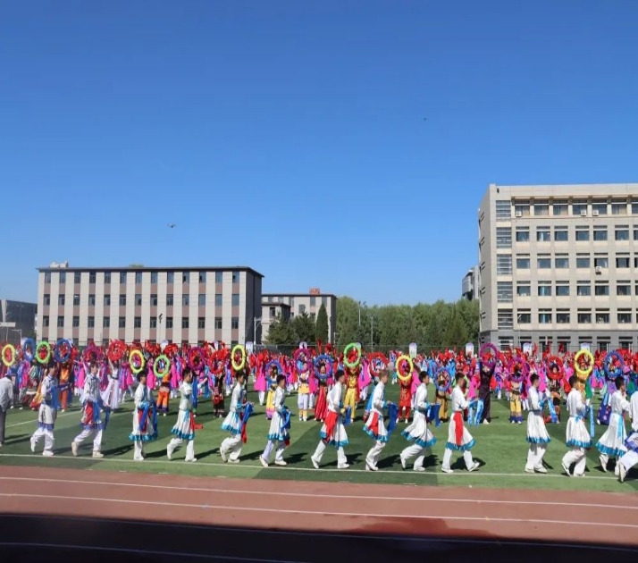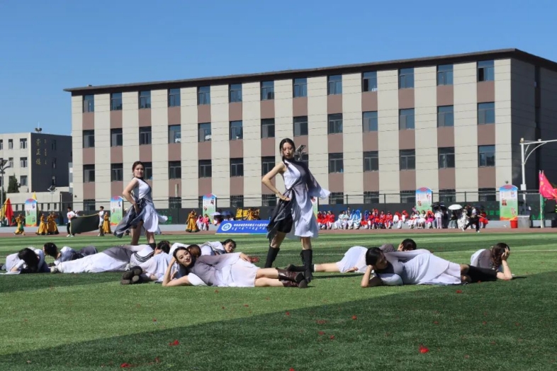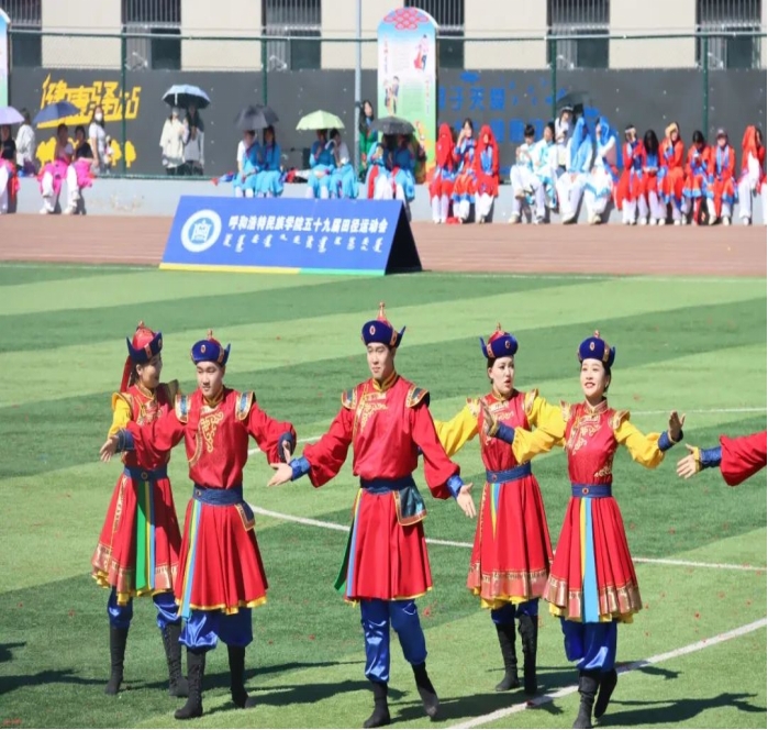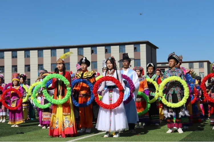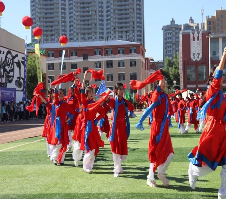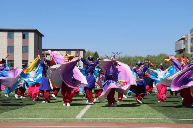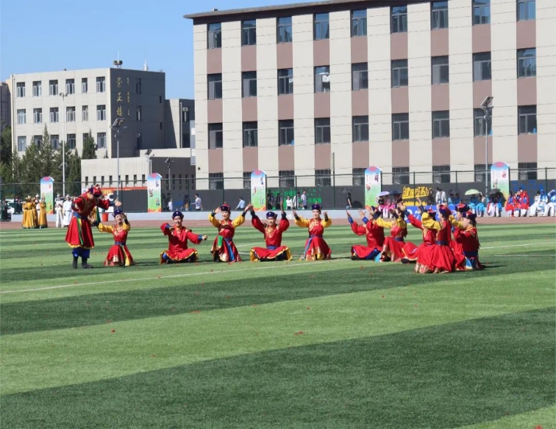 由656名同学组成的大型舞蹈《欢庆》作为本次那达慕文化节文艺演出的开场舞,56个民族拥舞着同心圆,象征着56个民族团结一心、同舟共济,圣洁的哈达传递着各民族之间的友好情谊,甩巾、摆巾、绕巾等动作优美潇洒的展示是与安代舞蹈的完美邂逅,飘动的绸带让五种颜色汇成了一片绽放的花海。